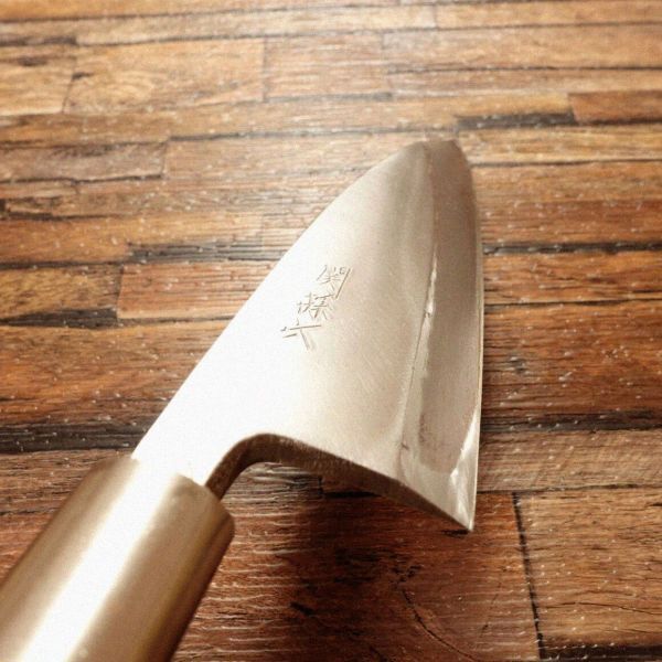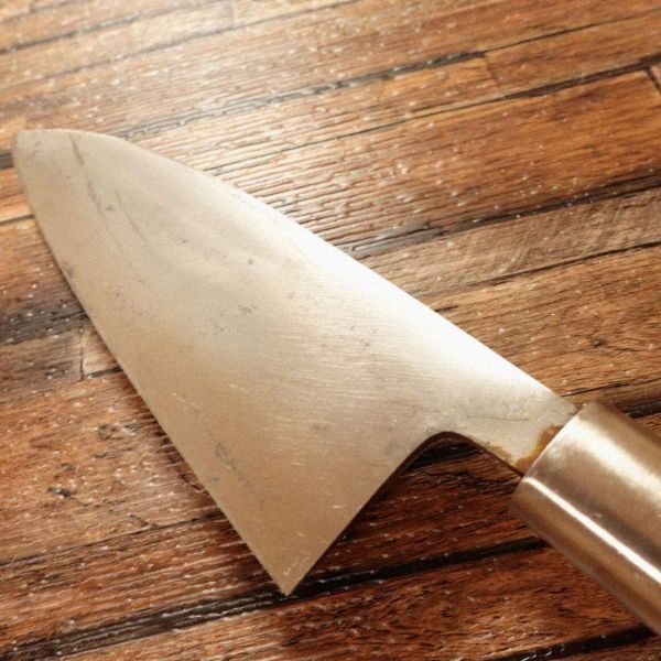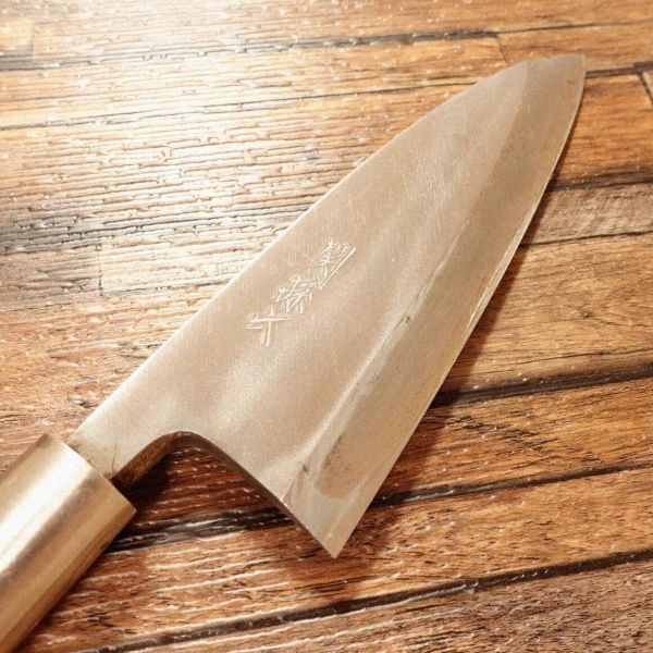 出刃包丁は、魚をさばく際に特化した和包丁で、丈夫な刃厚が特徴です。使用感あまりない保管されていたであろうお品です。柄に小さな亀裂が見られますが保管時のものでしょう。使用には影響ないでしょうが、お値段には反映しておりますので気にされない方はお買い得ですね。