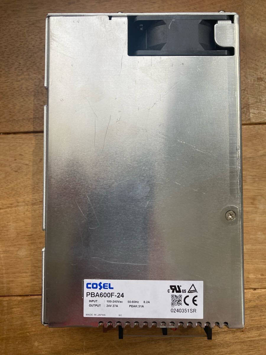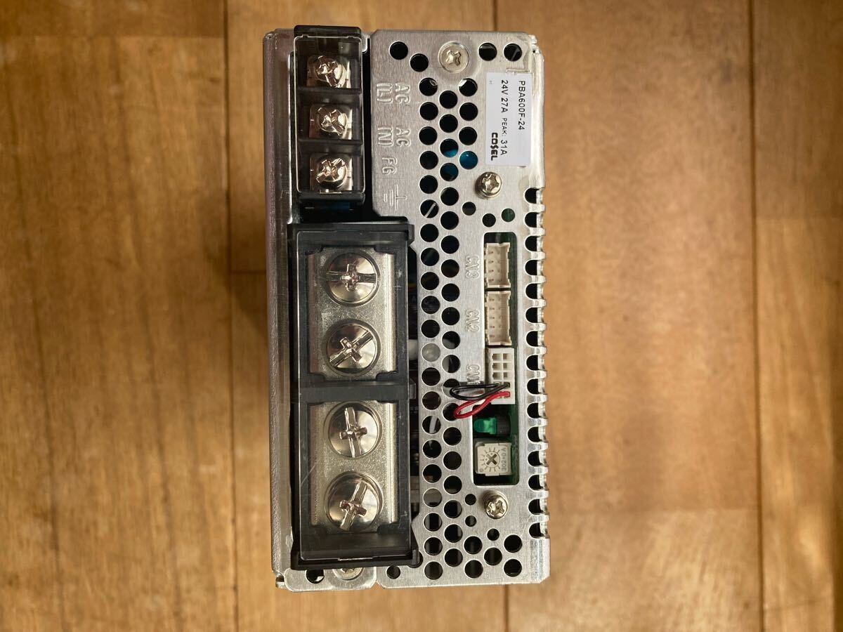 型式はPBA600F-24、AC85~264VまたはDC120~350V入力、最大出力27A、出力は端子台近くにボリュームがついており、出力電圧を可変できます。