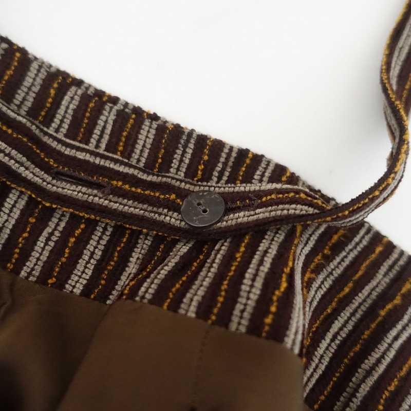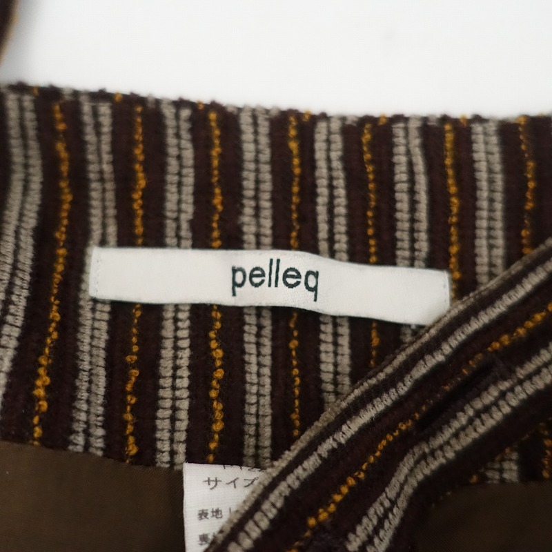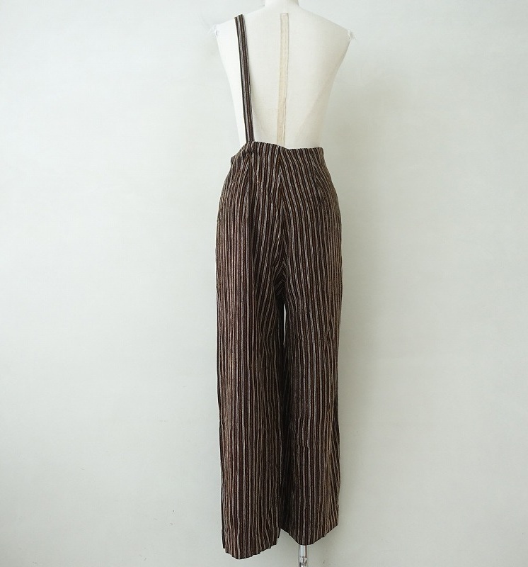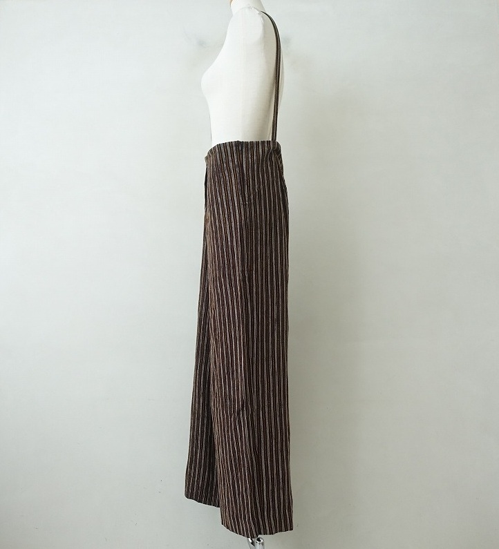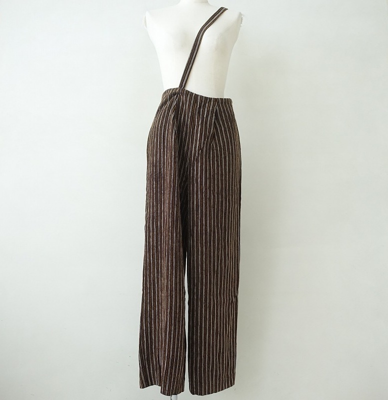 pelleqのSalopette trousers マルチストライプサロペットパンツです。カラーはブラウン、オレンジ、グレーなどのマルチストライプで、モール地のような素材で仕立てられています。ワンショルダーの肩ひもは取り外し&長さ調整可能、左サイドにファスナー付きです。裏地付き、定価(メーカー希望小売価格) 72,600円の商品です。 |