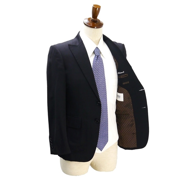 ・春秋対応。2つボタンシングル。総裏地仕上げ。センターベント。フラップポケット。ネーム刺繍あり。本切羽。