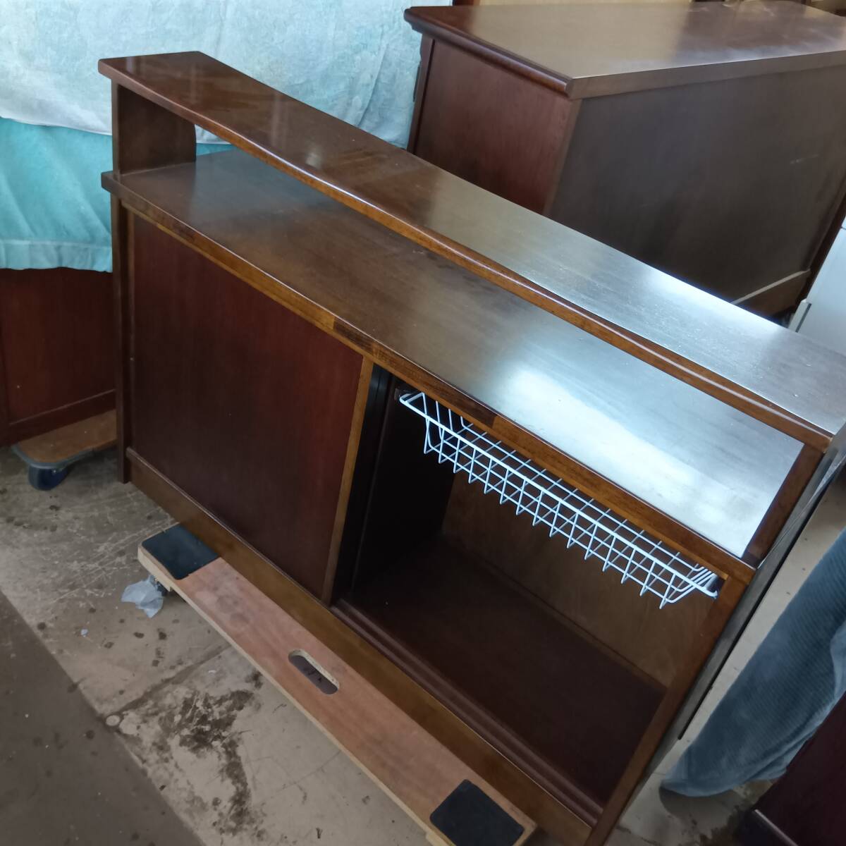 背面には引き戸式の収納と棚板、ワイヤーバスケット付きで、食器や小物をすっきりと収納可能。