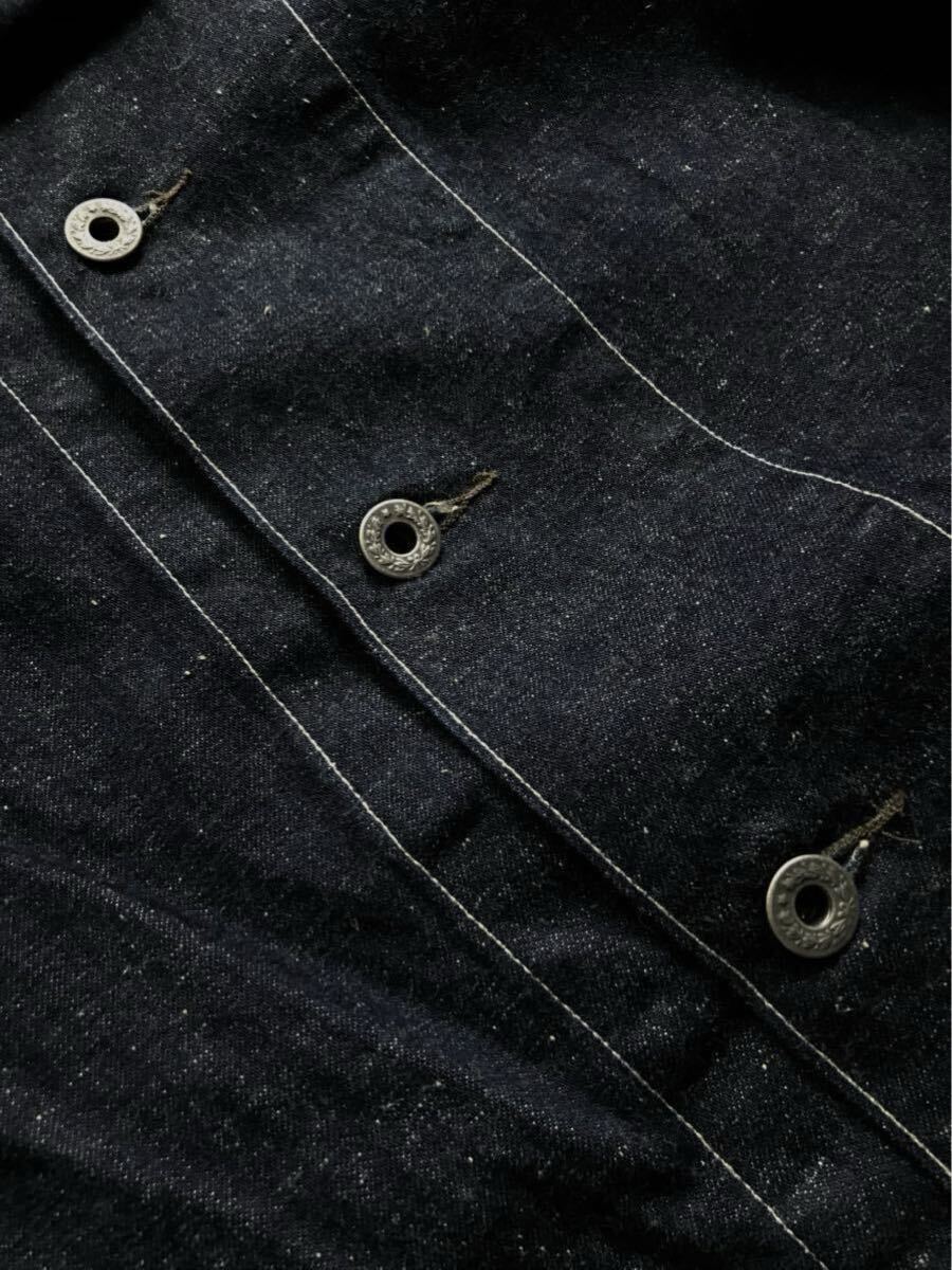 このモデルの為だけに仕立てられた、起毛感のあるネップの質感が堪らない最高品質のデニム地を採用。加工を施したメタルの月桂樹ボタンがアクセントとなり、ヴィンテージ好きも唸らせる圧巻の出来栄え。