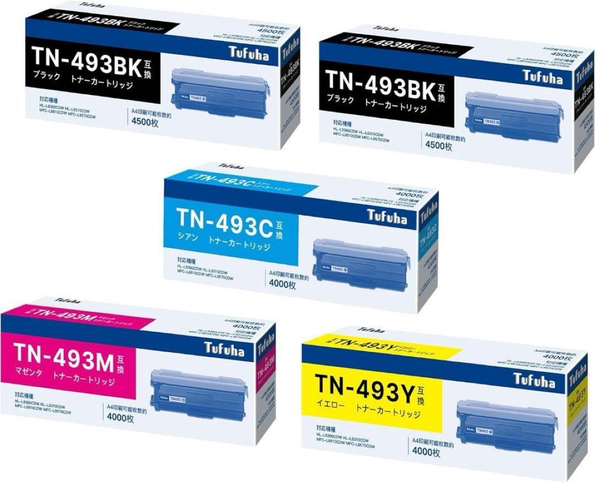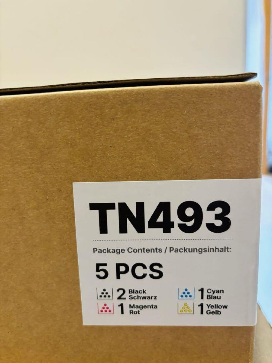 【全色セット】TN493 大容量 5本セット( TN-493BK ブラック*2 TN-493C シアン TN-493M マゼンタ TN-493Y イエロー)。