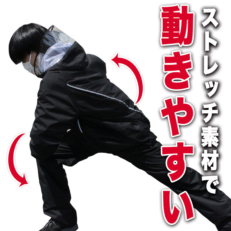 ・上着の前後ろとズボンの右脚裏に再帰反射(リフレクト)配置で夜道も安心。