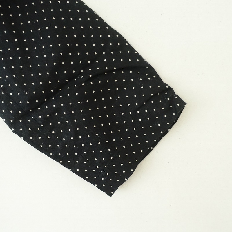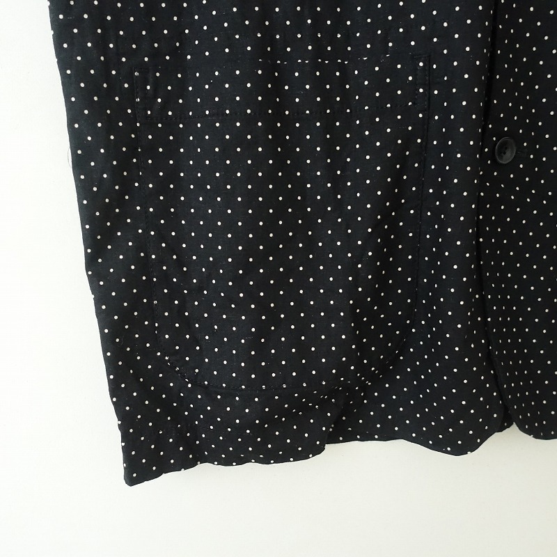 | 2025年春夏コレクション JOURNAL STANDARD LUXEのコットンリネンドットジャケットです。カラーはブラックにホワイトのドット柄プリントで、麻綿混紡の布帛地です。フロントボタンで着脱でき、袖口に留め具は無いデザインで、バックセンターベント入りです。前腰左右にパッチポケットがあり、裏地は付いておりません。定価(メーカー希望小売価格)35,200円の商品です。 |