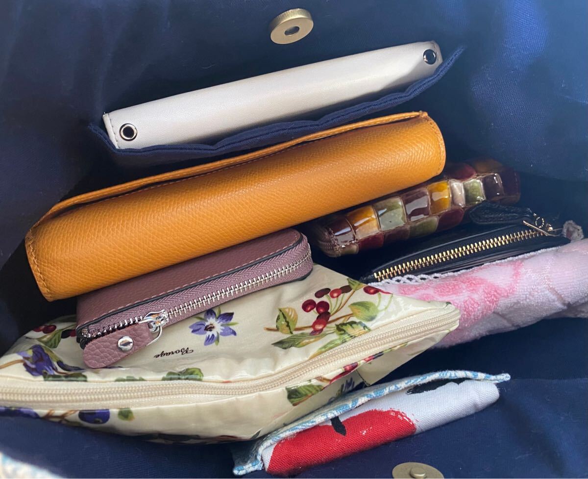 財布、携帯、キーケース、化粧ポーチも余裕で入ります。内側にポケットを2つ付けているのでとても使いやすいと思います♪