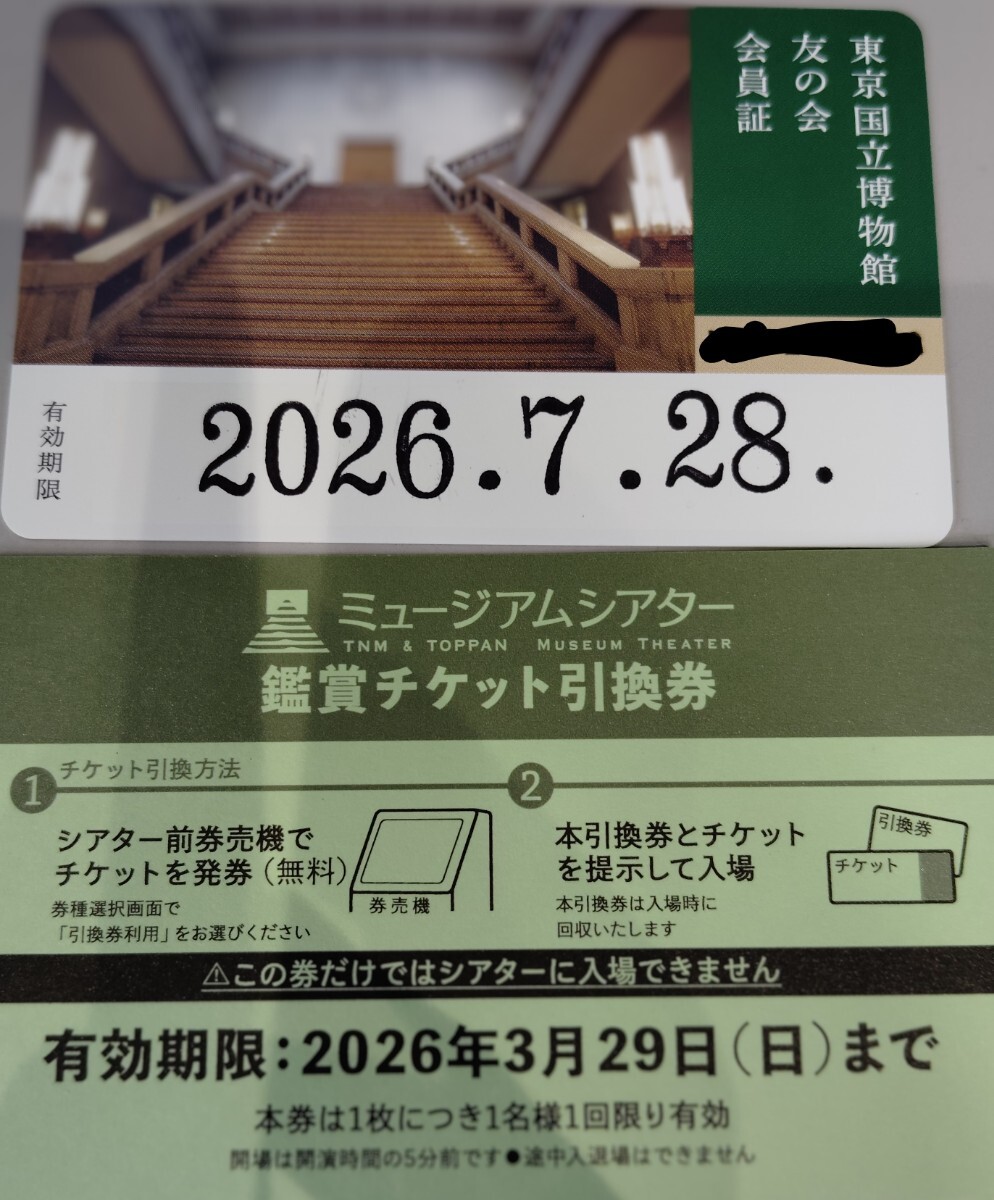 ★東京国立博物館の友の会会員証とミュージアムシアター引換券が各1枚です