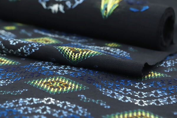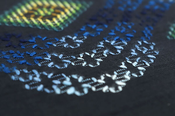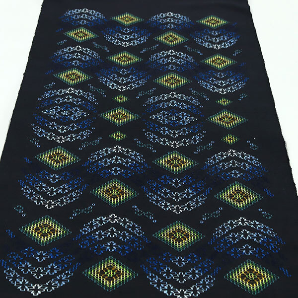 青色、ライトブルー、薄黄色、緑色、菜種油色などの色とりどりのお色目の糸で、ふっくらとした花織が施されております。