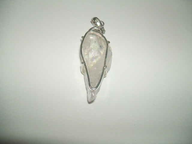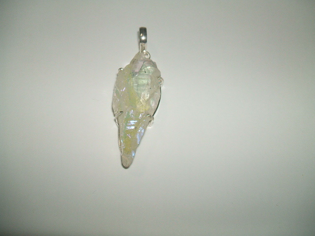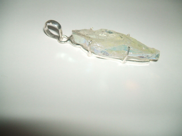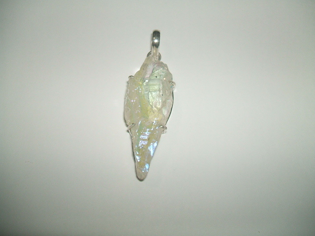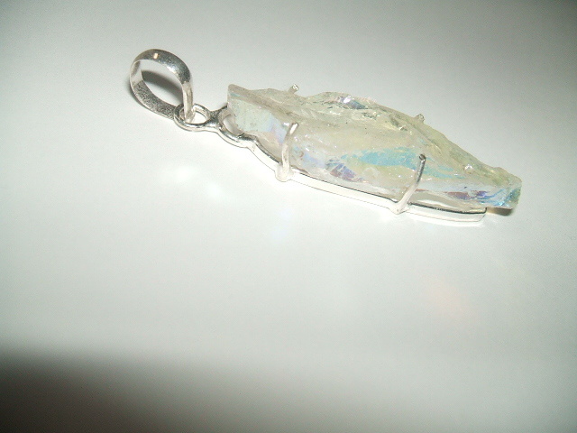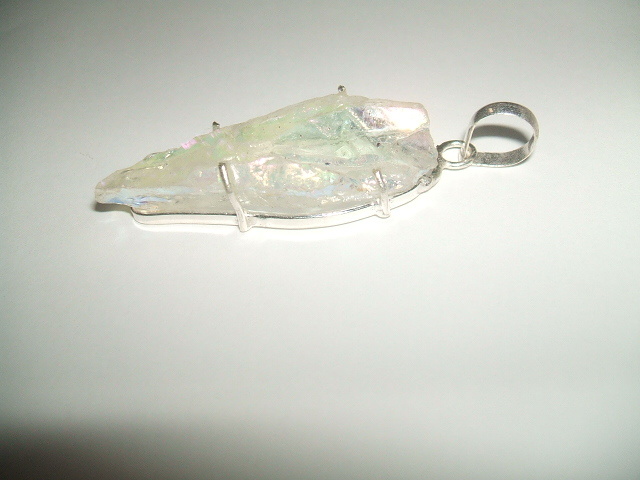 クォーツにチタンが結合してメタリックな色と輝きが見られるチタンオーラクォーツ原石トップです。細長い石の大きさは約4.7x1.5センチ、厚みは一番厚いところで約5ミリ。金属はシルバーで925の刻印があります。なお、写真の発光色や雰囲気は実物と全く同じではありませんので、あらかじめご了承ください。