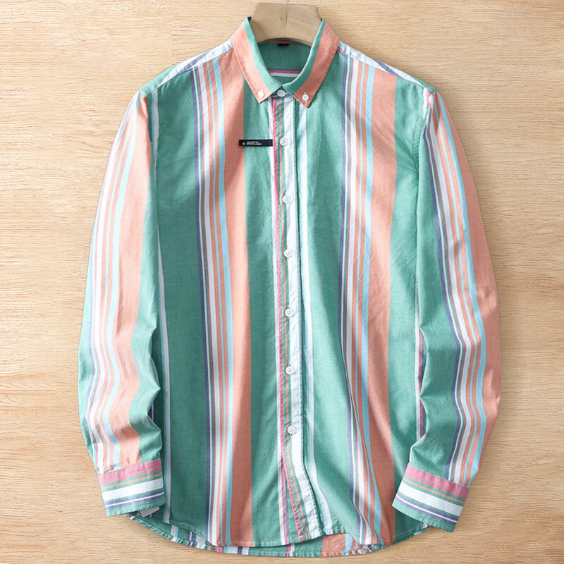 新品 DCKMANY 緑 ストライプ オックスフォード ウォッシュ 綿100% 長袖シャツ メンズ ボタンダウン 春秋 レギュラーカラー カジュアル トップス