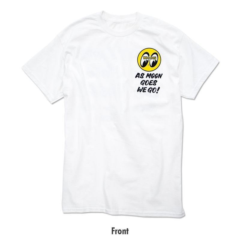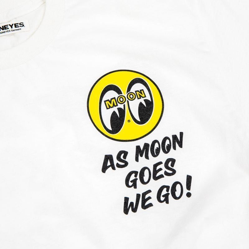 レタリング オンリーのシンプルなTシャツで、フロントにはワンポイントで MOON アイボール ロゴに、バックと同じスタイルで書かれた AS MOON GOES WE GO! とプリントしています。