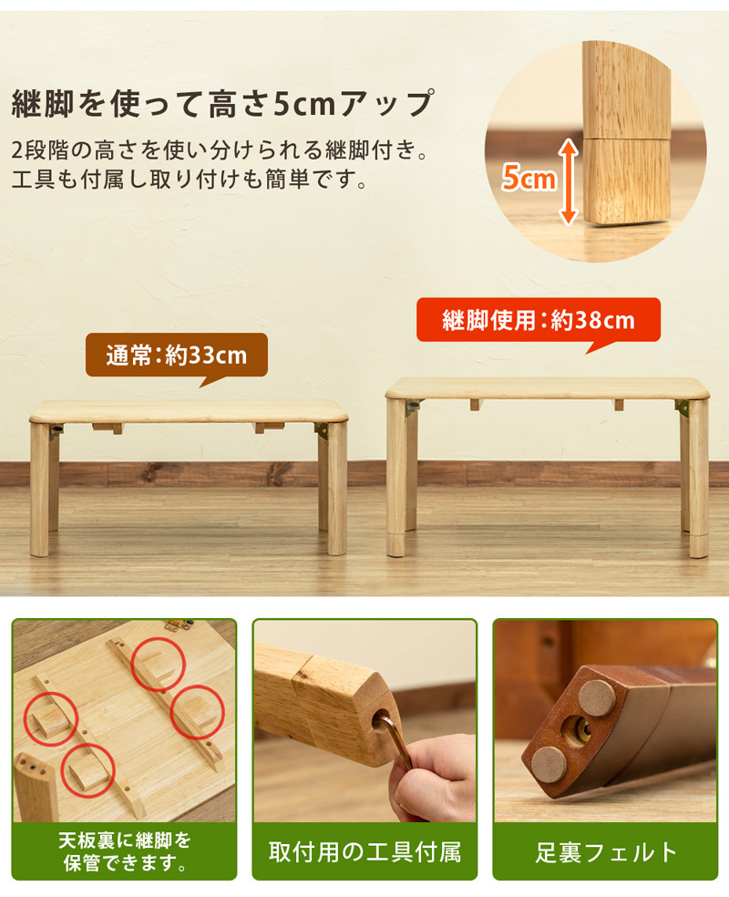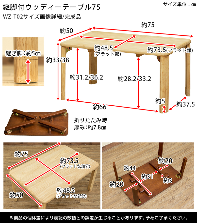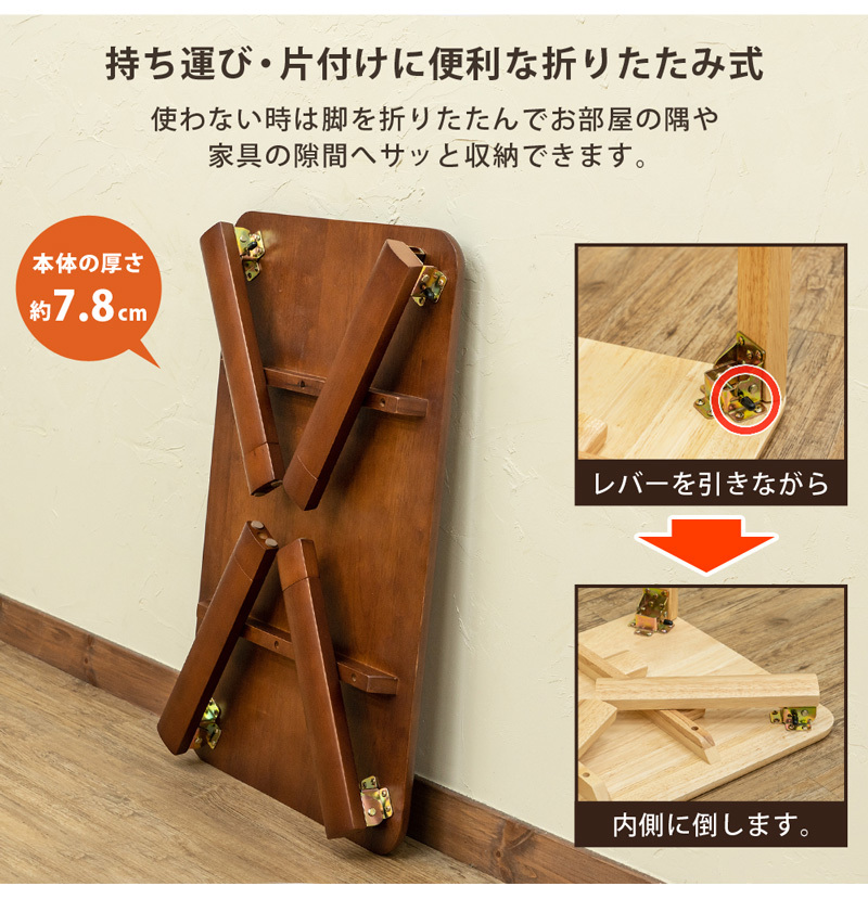 | サイズ | (W)幅75cm×(D)奥行き50cm×(H)高さ33/38cm 天板の厚み:約1.8cm 折りたたみ時の厚み:約7.8cm |