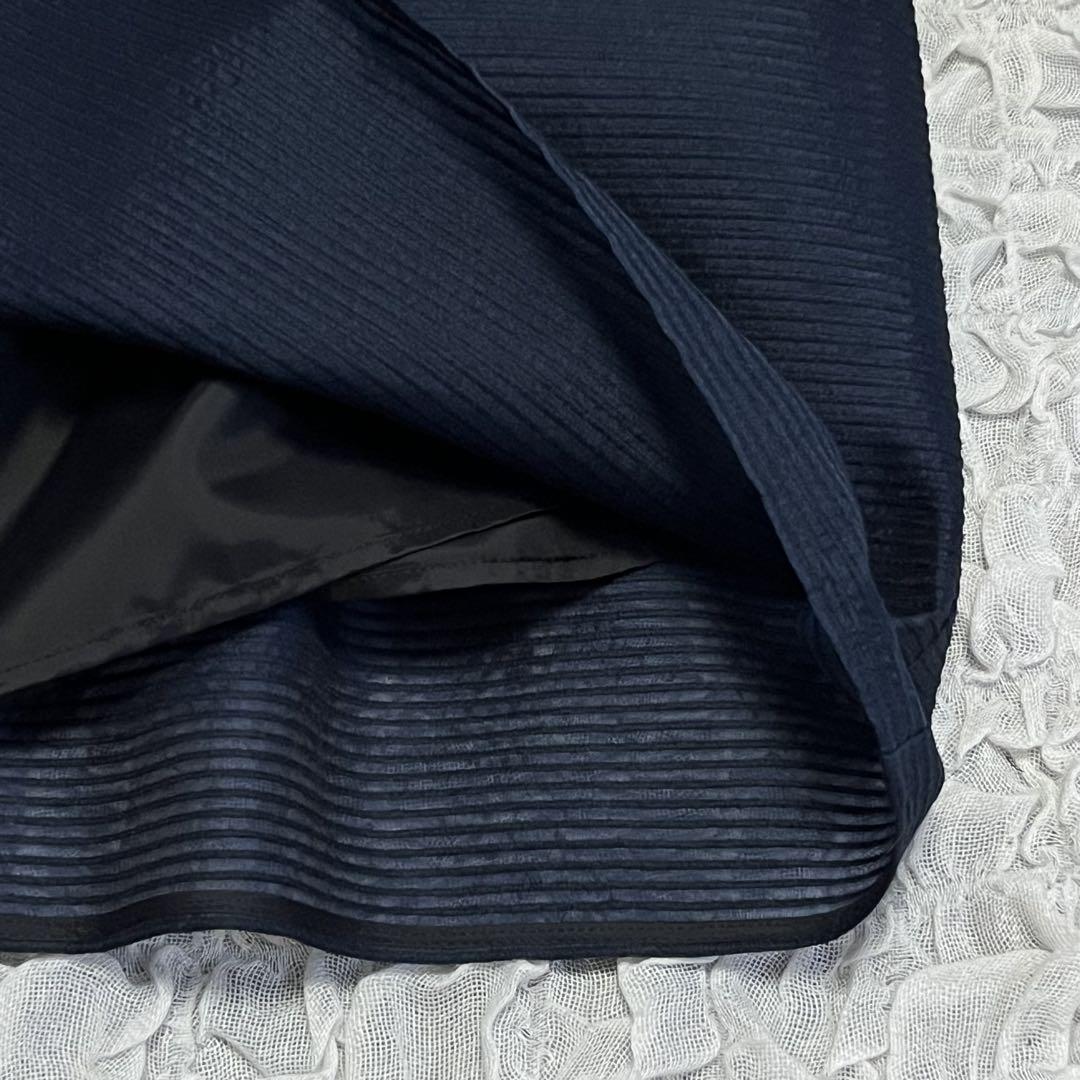 紺の光沢のある生地と上品なデザインがエレガントです。 バックスタイルはIラインに黒ブラックのパイピングが可愛いです。