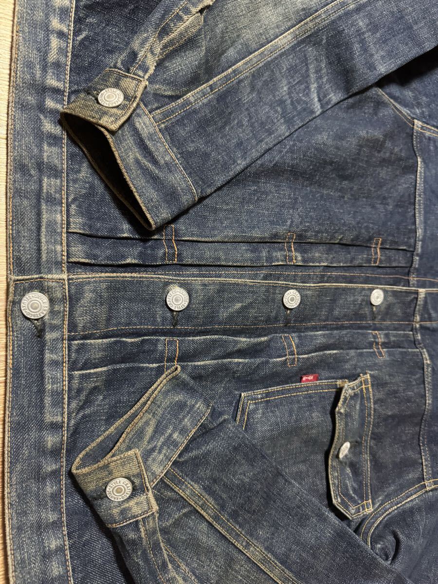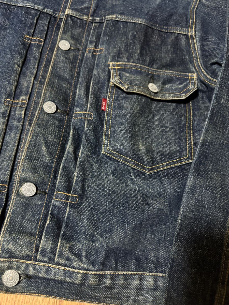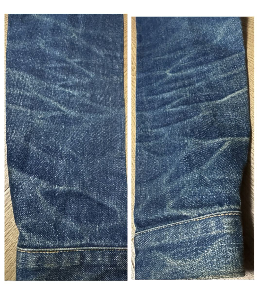 デニム特有のアタリや色むら、使用感、薄い汚れあり。大きなダメージなく着用に問題ありません。