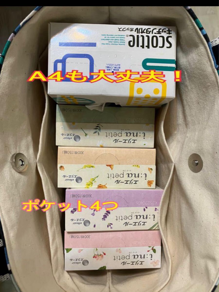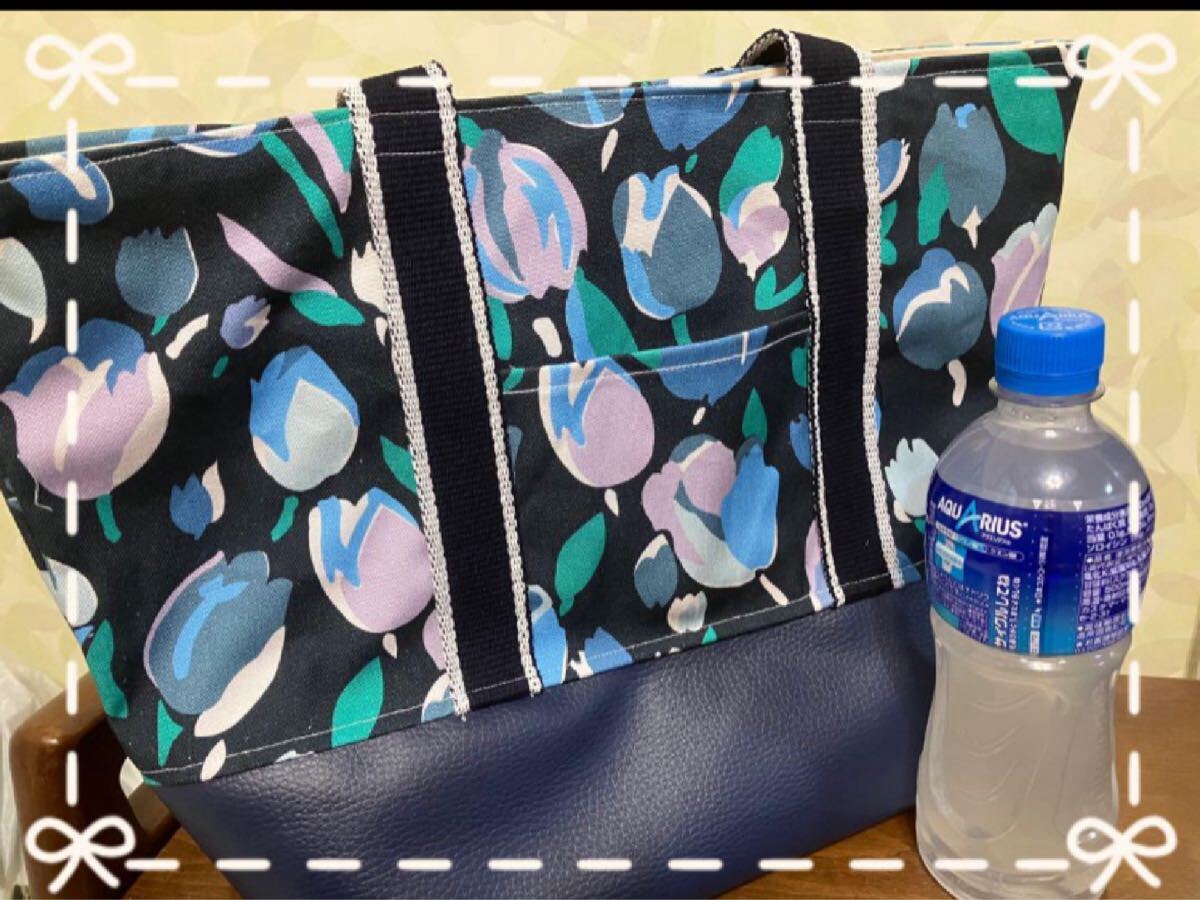 底を合皮に(水濡れ、破れ防止)しました。お出かけや、お買い物、全ての場面で使える大きめのバッグです。荷物が、多いい方用です。