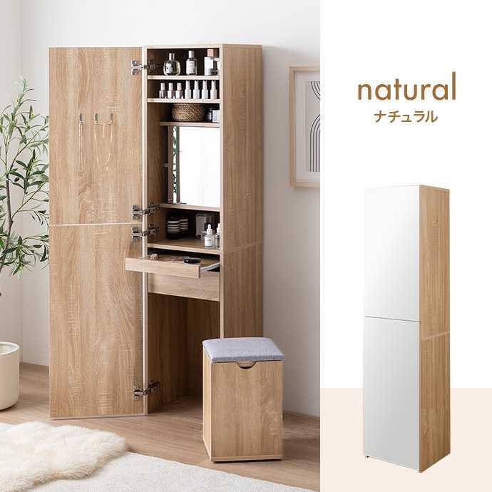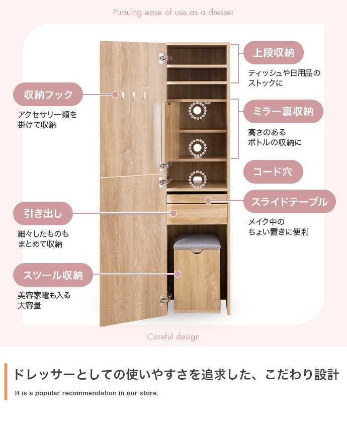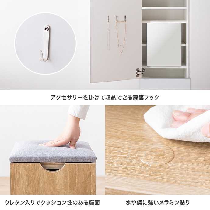 鏡裏やスツール内など見えない場所にもたっぷり収納を備え、コスメはもちろんアイロンなどの美容家電もすっきり収納いただけます。
