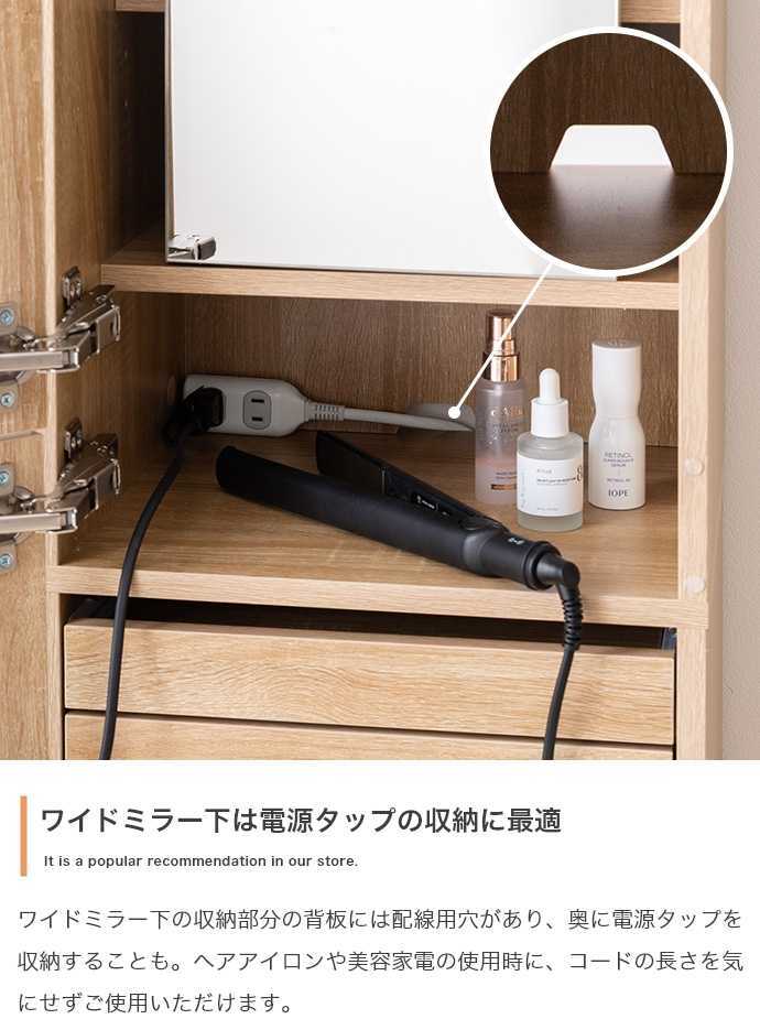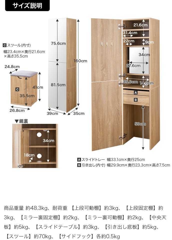 【耐荷重】上段可動棚:約3kg、上段固定棚:約3kg、ミラー裏固定棚:約2kg、ミラー裏可動棚:約2kg中央天板:約5kg、スライドテーブル:約3kg、引き出し底板:約5kg、スツール:約70kg、サイドフック:各約0.5kg