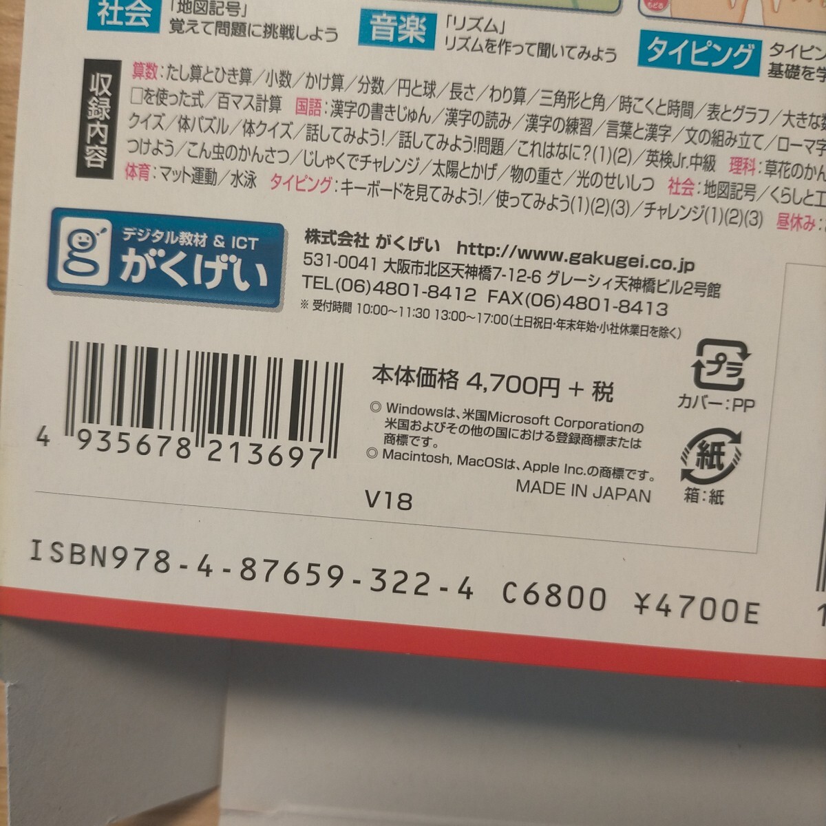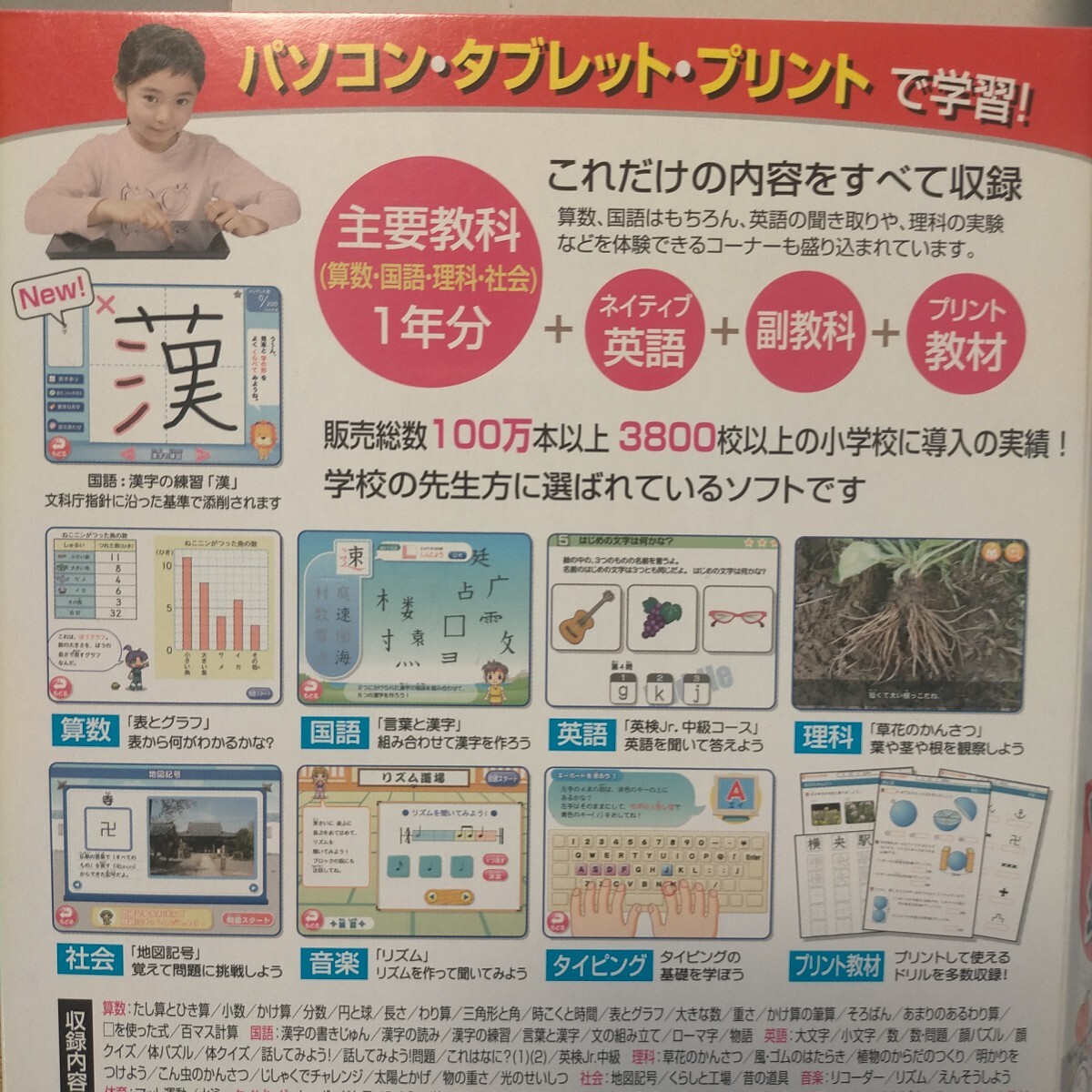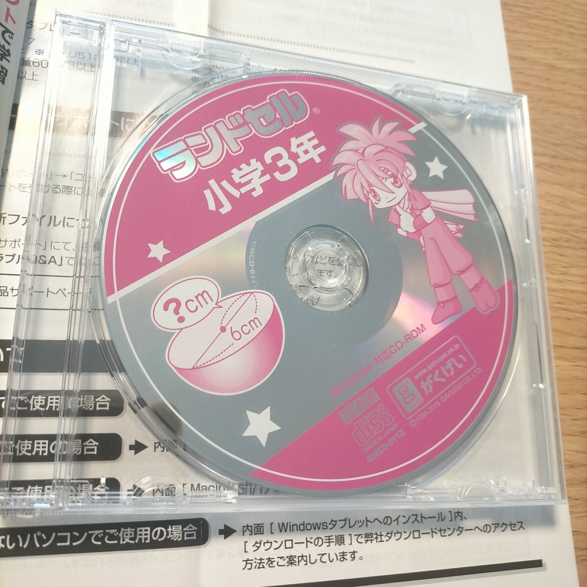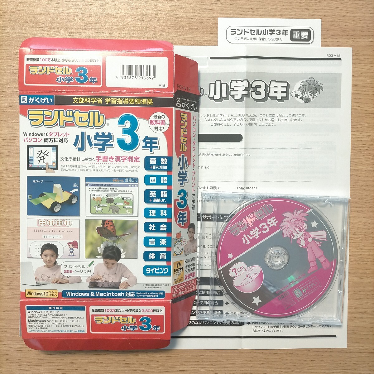 <商品概要> ・自宅保管品。がくげい ランドセル小学3年のPC教育ソフトになります。写真1枚目に写っている外箱・プラケース・CDディスク・取扱い説明書・シリアルNoの書かれた紙のみになります。内箱はありません。盤面に多少の擦れ、傷があります。ディスクは読み取り確認済みです。プラケースに擦れ・傷、外箱・紙類に傷、ヨレ/折れ/シワ、汚れなどの傷みがあります。動作環境はWindows10/8.1/7となっております。当方詳しくありませんのでご質問されても答えられません。また対応OSなどで動作するかなどについてもわかりませんのでご自身でお調べの上でのご購入をお願い致します。購入後に動作しないなどの保証はできませんので予めご了承の上でご購入をお願い致します。状態をチェック済みですがもし見落としなどがありましたらどうぞご容赦下さい。