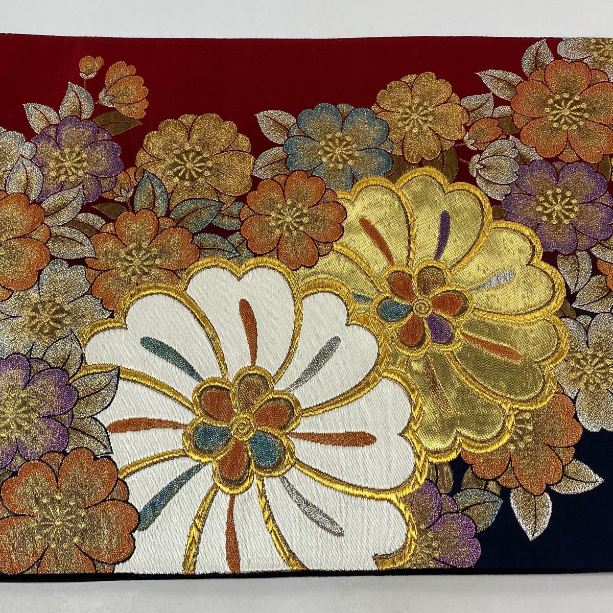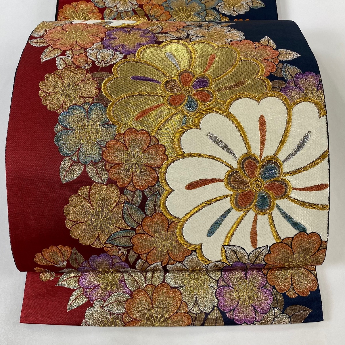 | 袋帯 美品 秀品 草花 桜 箔 金糸 えんじ色 六通 正絹 【中古】 |