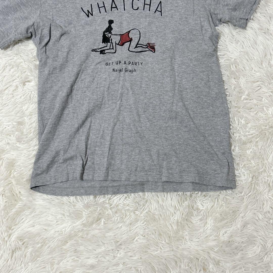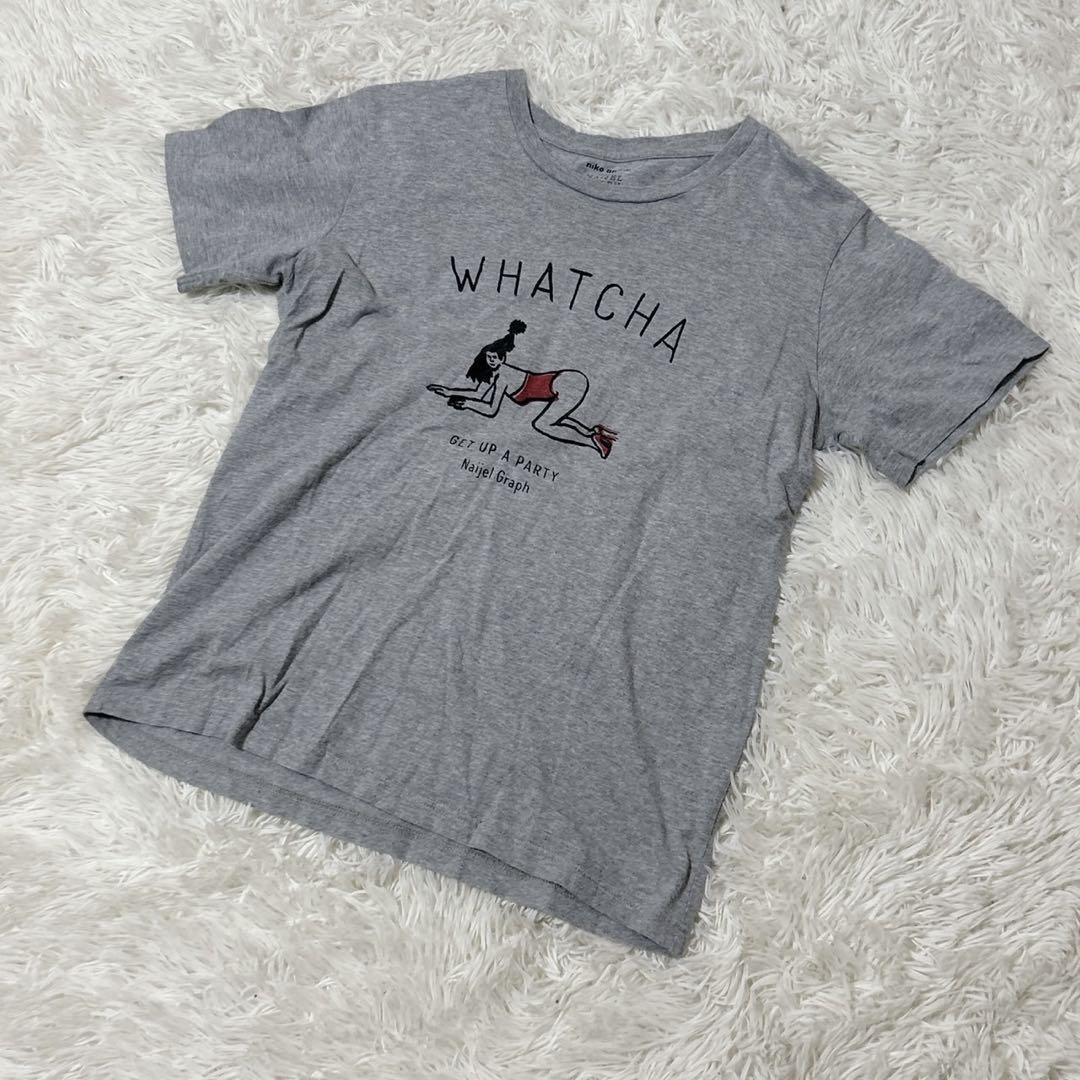 グレーの半袖Tシャツ、ユニークなイラストとメッセージが特徴。