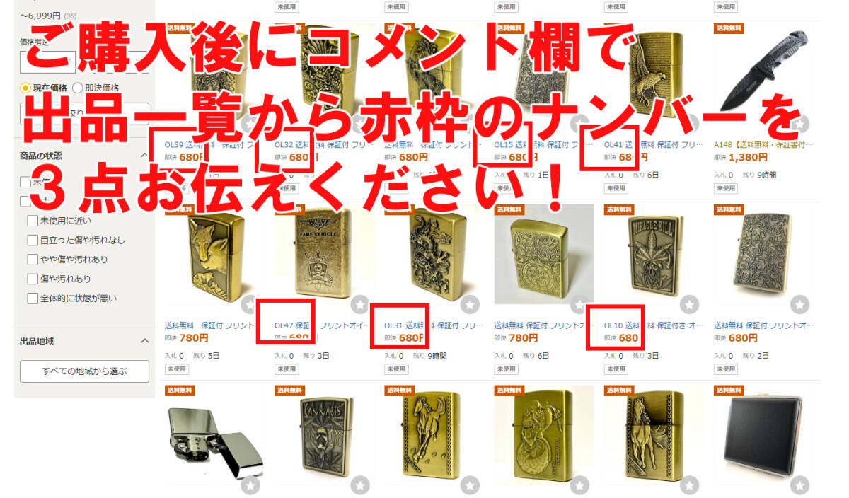 購入後に当店の商品一覧からお好きなオイルライター3点の商品NO(OL23など)をお伝えください!