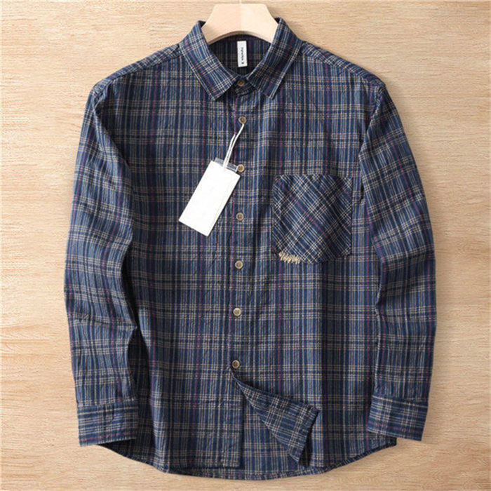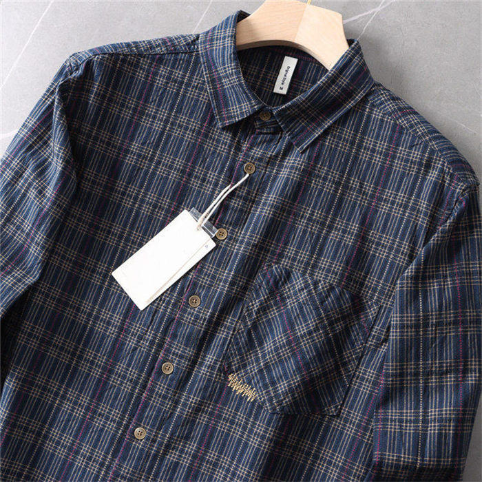 Y6280-M ネイビー 新品 長袖シャツ 綿麻混 先染め ウォッシュ加工 格子柄 チェック 快適 通気 夏秋 ゆったり メンズ レギュラーカラー