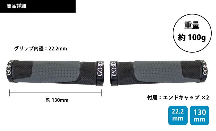 マウンテンバイクやクロスバイクなど、フラットハンドルの自転車に最適なグリップです。 グリップ本体はグレーの部分(手の平に接触する部分)は柔らかいので手の平が 痛くなるのを軽減してくれます。 両端をボルトで固定のダブルロッキング 取り付け取り外しも簡単です。 内容 本体サイズ サイズ約:130mm 重量:約100g(ペア) 付属:エンドキャップ 内径22.2mm 3層構造 グレーは工具付属していません。 ・ディスプレイ環境により実物と色が異なる場合が有ります。 ・入荷時期により予告無く一部仕様変更する場合が有ります。 ・表記サイズは商品の伸びの無い寸法計測数値です。 | |