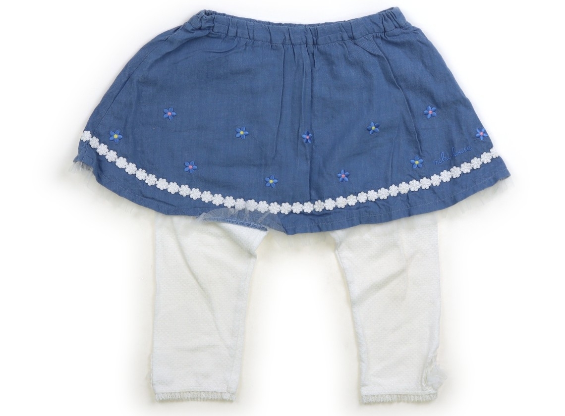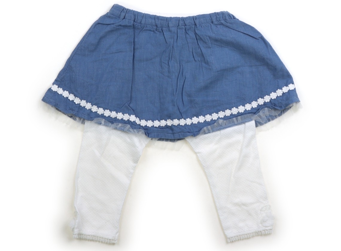 綿・ポリエステル素材のレギンス一体型。スカートは薄手の綿素材。ウエストは総ゴムです。全体的に毛羽立ちあり。両ひざ周りに薄い黄ばみ汚れがありますが、まだお使いいただけそうです。