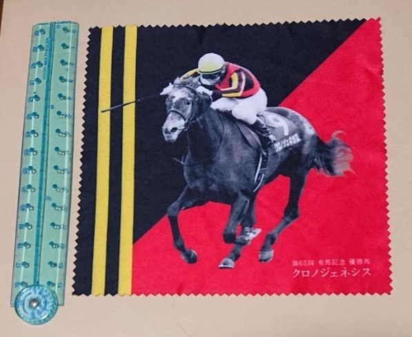有馬記念のキャンペーンて送られてきたものです。開封はされていますが未使用で、クリアファイルに入れて保管していたため特に痛み等ありません。大きさは写真の定規を参考にしてください(15センチ弱です)。