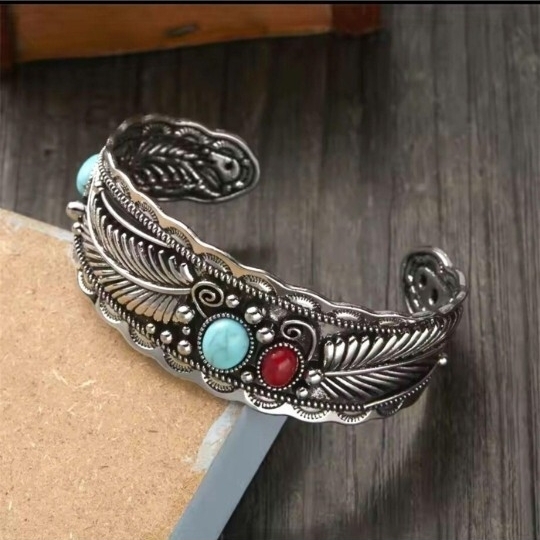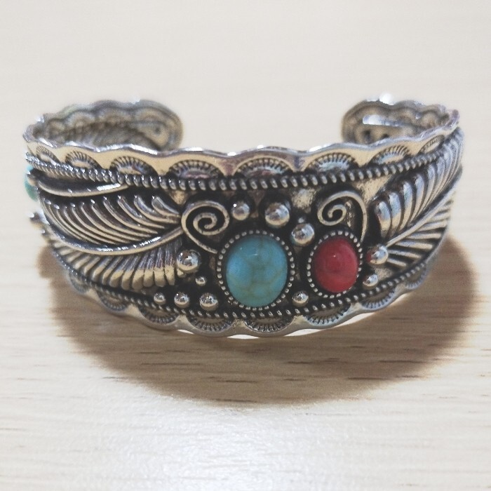 エスニック バングル シルバー ブレスレット ボヘミアン ターコイズ ビーズ 太め 腕輪 アクセサリー 羽