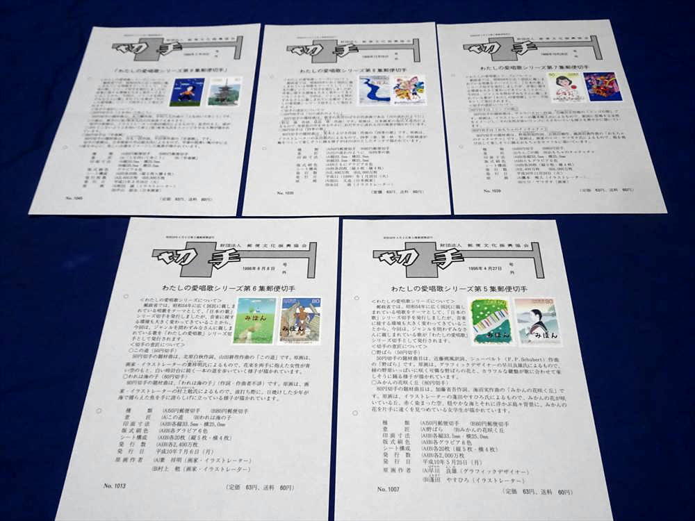 郵政省が新切手を発行する際にお客様に知らせるため、見本切手を貼り窓口に掲示した解説書「切手」。そのわたしの愛唱歌シリーズ第1-9集のセットです。
