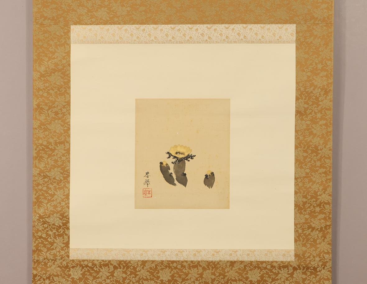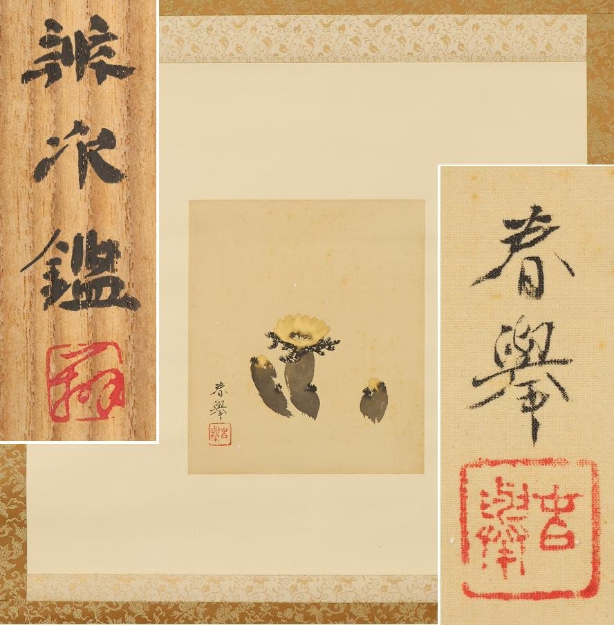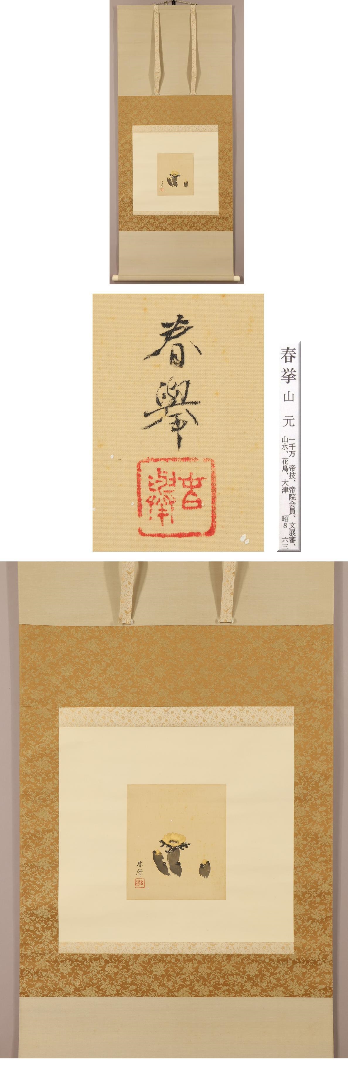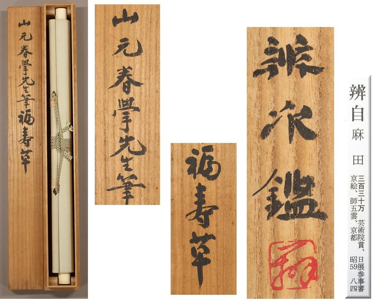 【真作】山元春擧(山元春挙)◆福寿草◆麻田辧次(麻田辧自)鑑定箱◆肉筆◆絹本◆掛軸◆w697