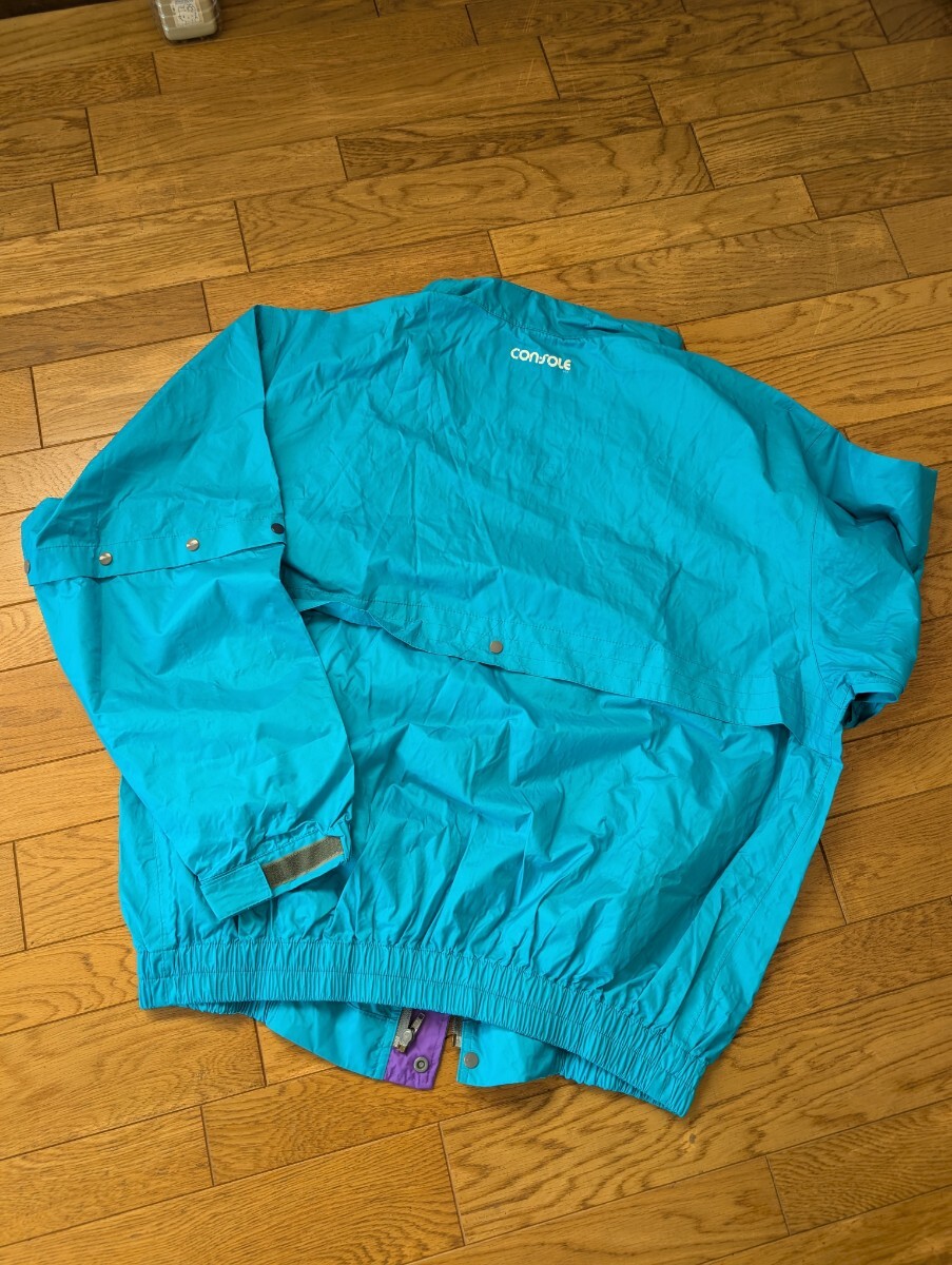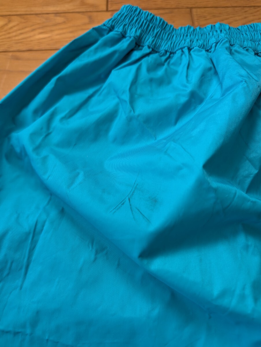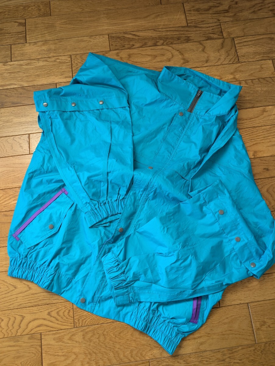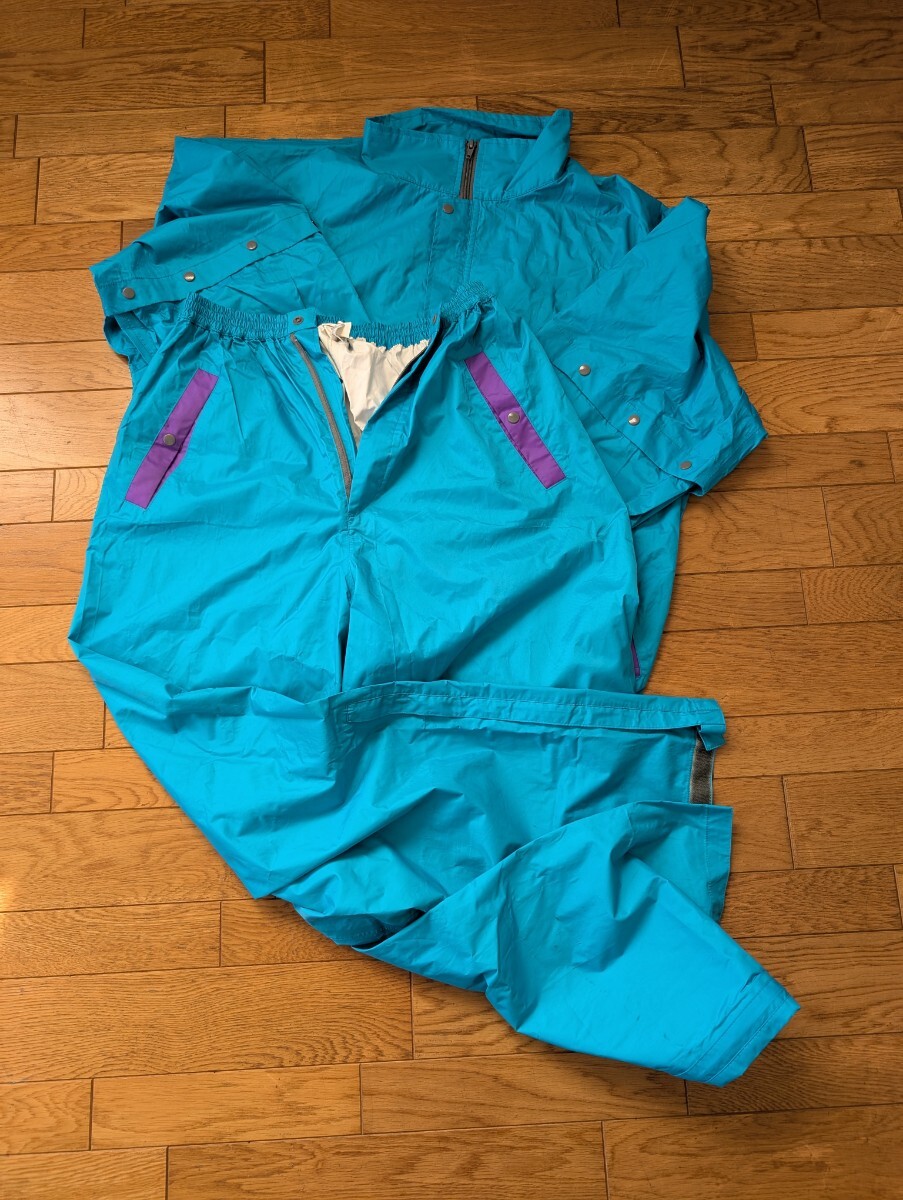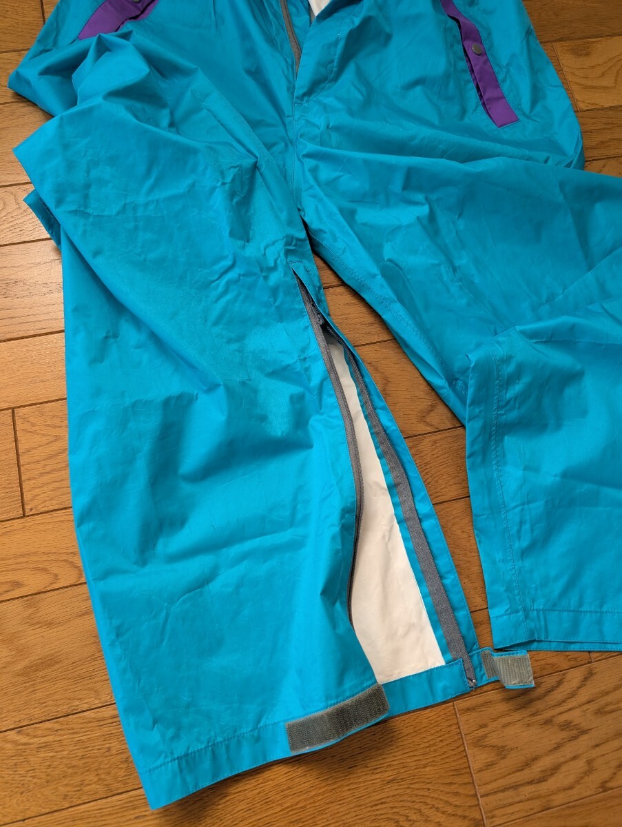 ターコイズ色の上下セットレインスーツ、紫のアクセント付き、LLサイズ。