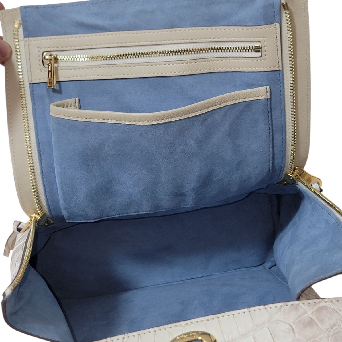 ゴールドの金具と裏生地の水色のスエードが遊び心あるデザインです。
