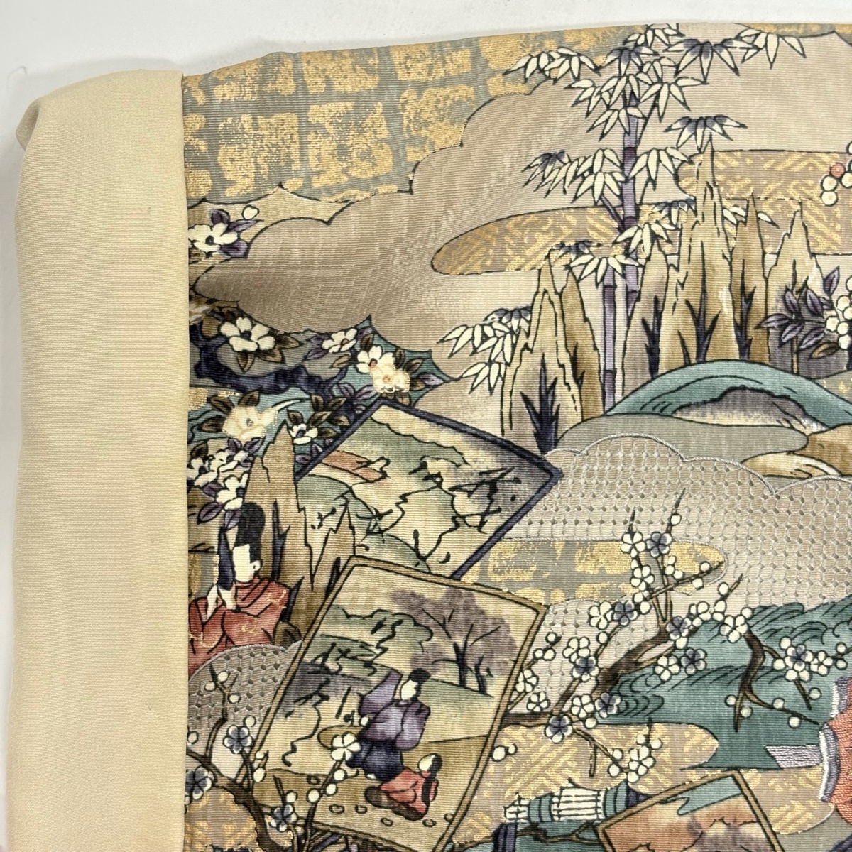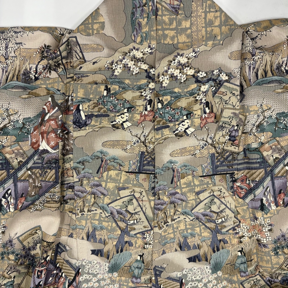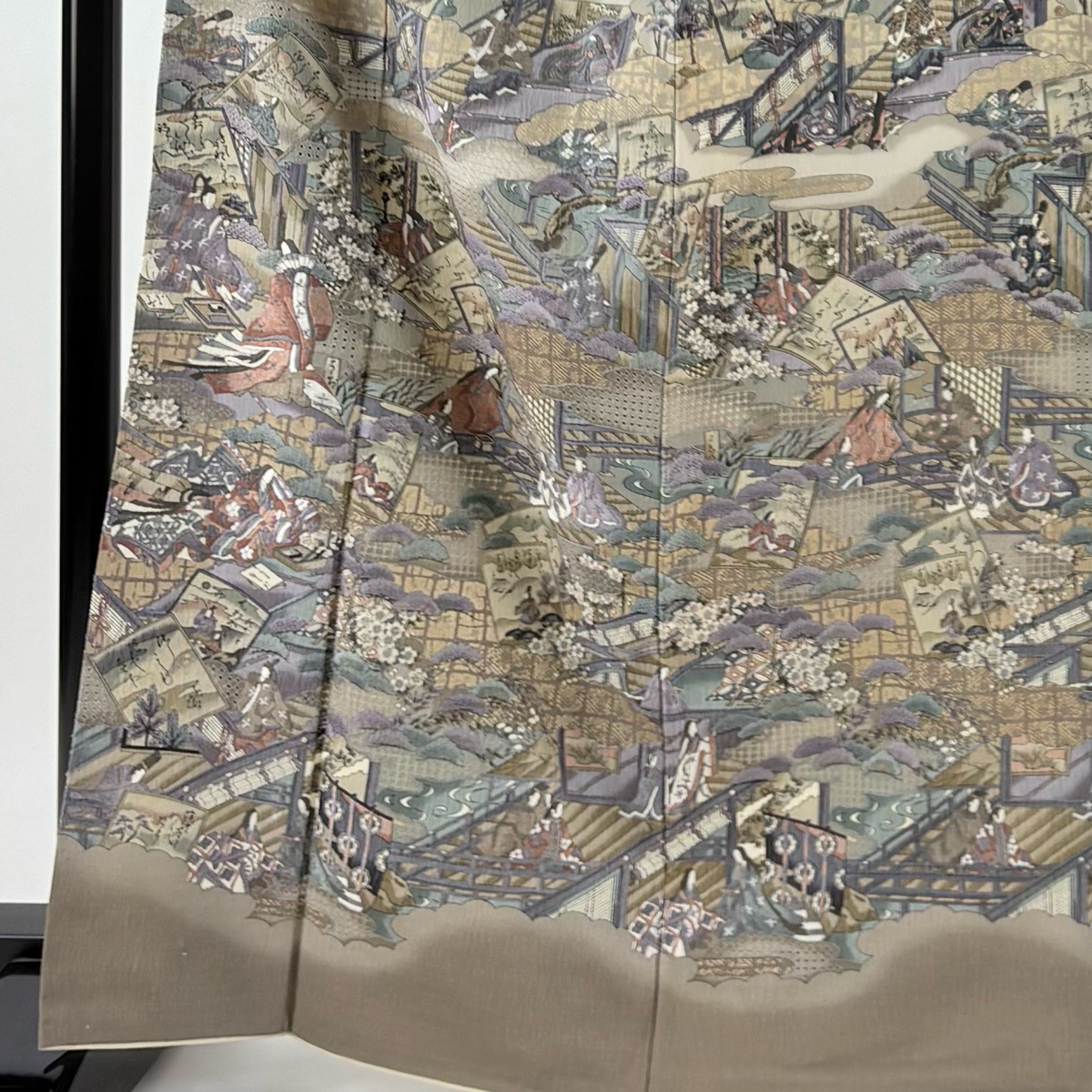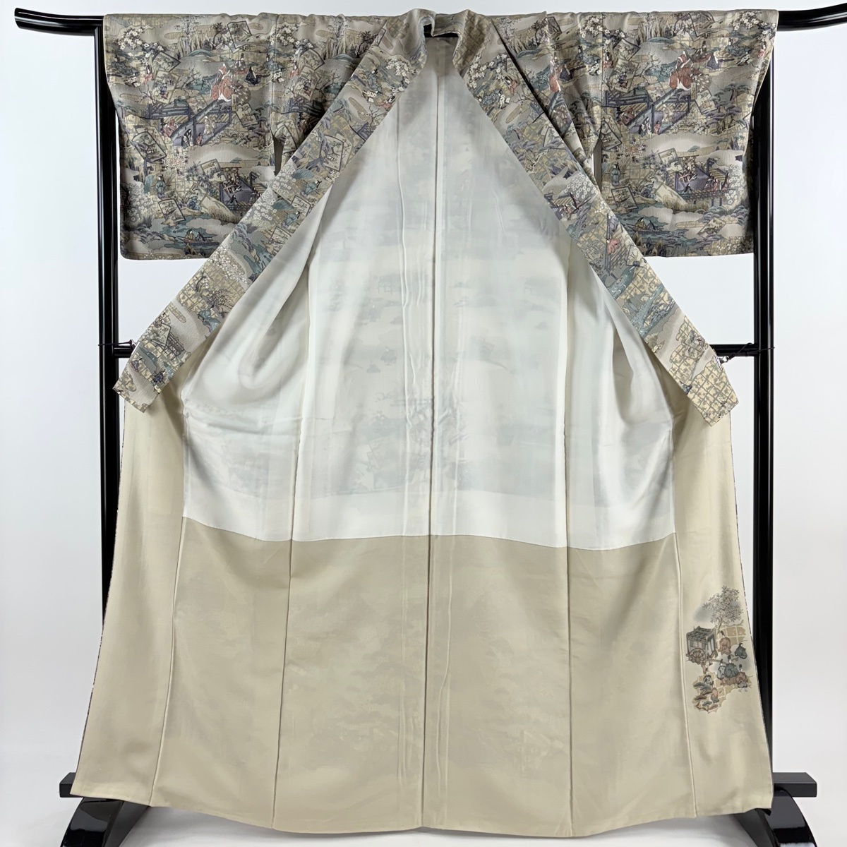 | 訪問着 美品 名品 紬地 かるた 御所風景 刺繍 金糸 灰茶 袷 身丈166 裄丈67 M 正絹 【中古】 |