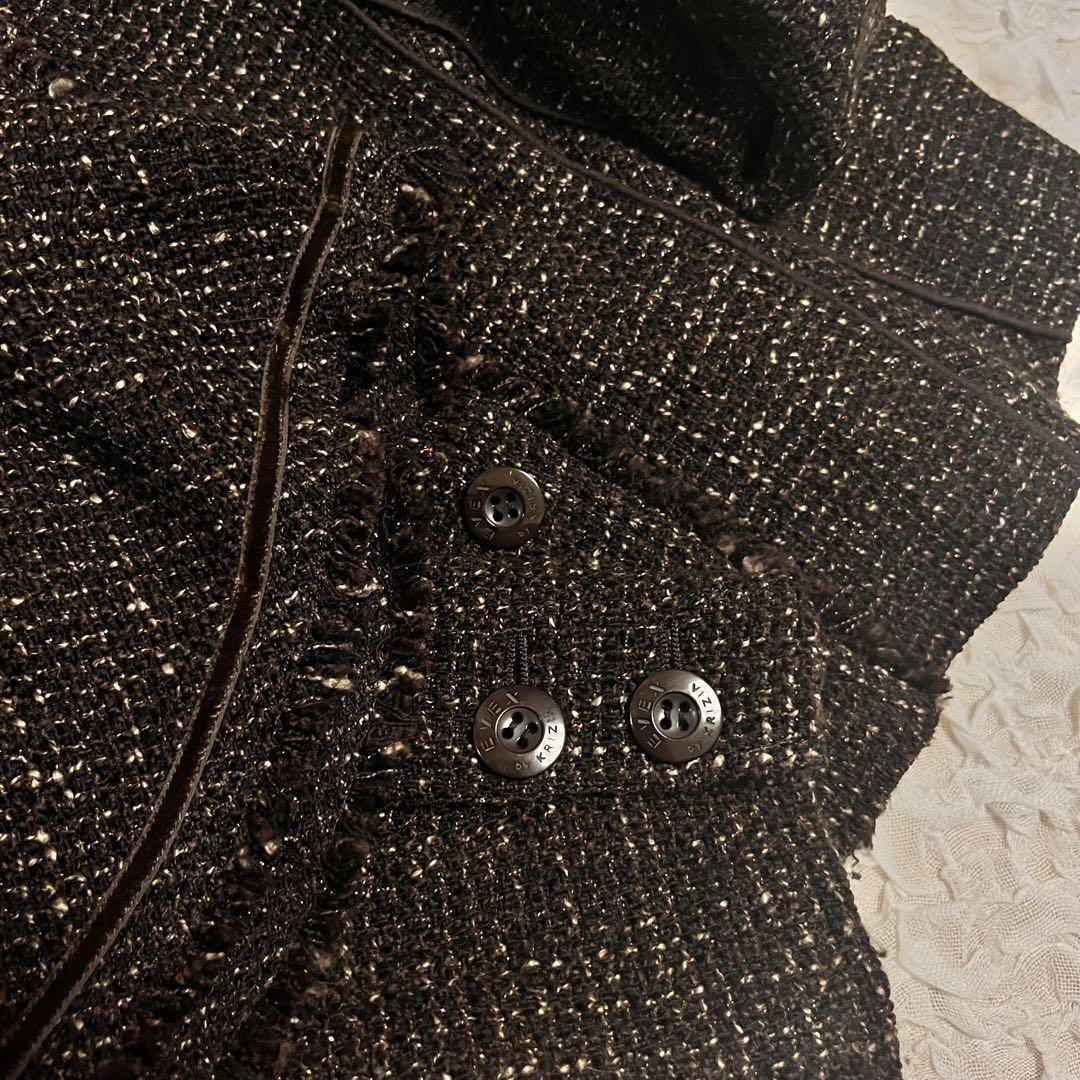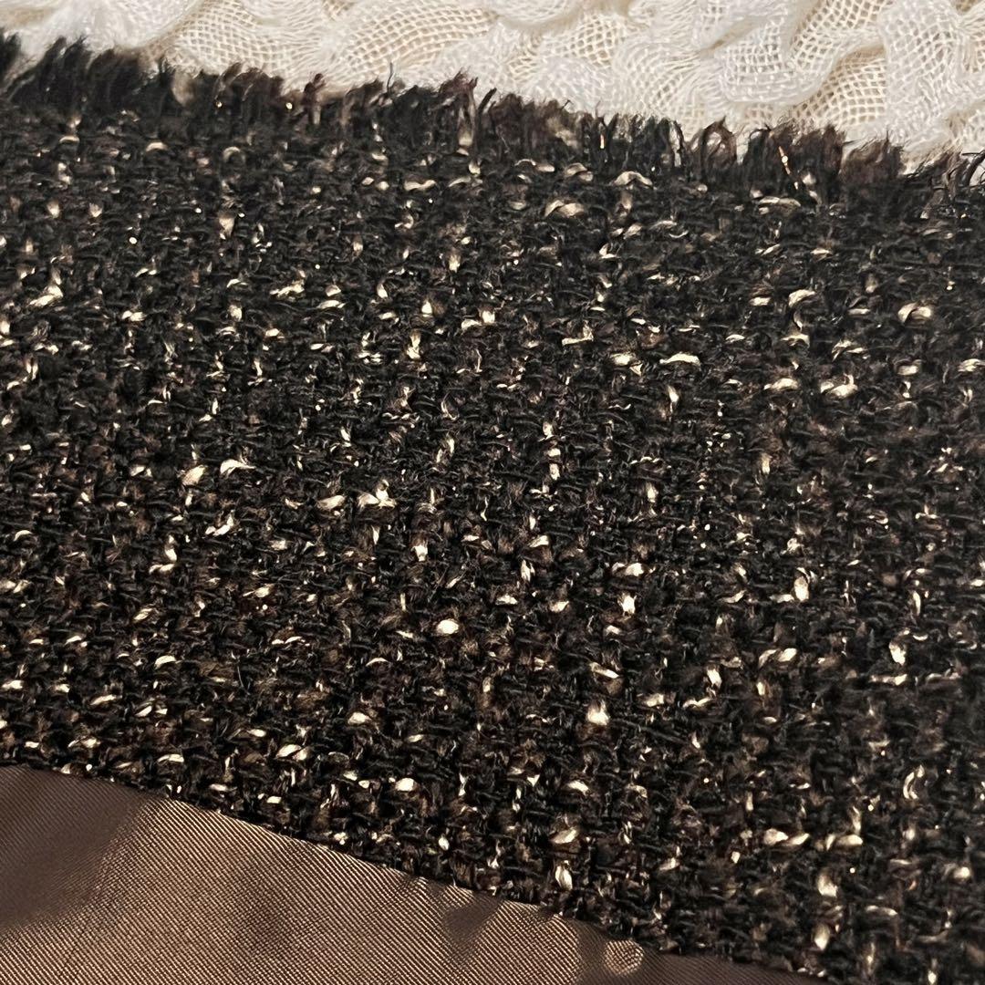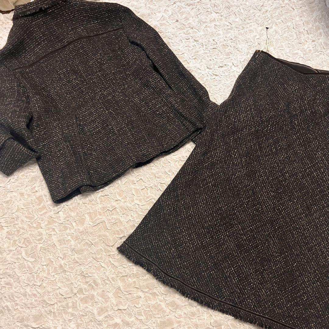 このスカートスーツは、ラメのミックスツイードにベロアやフリンジ エレガントなデザインが特徴です。アンゴラとカシミヤを使用しており、柔らかく暖かい着心地を提供します。高級感あふれる素材は、特別な場面にもぴったりです。