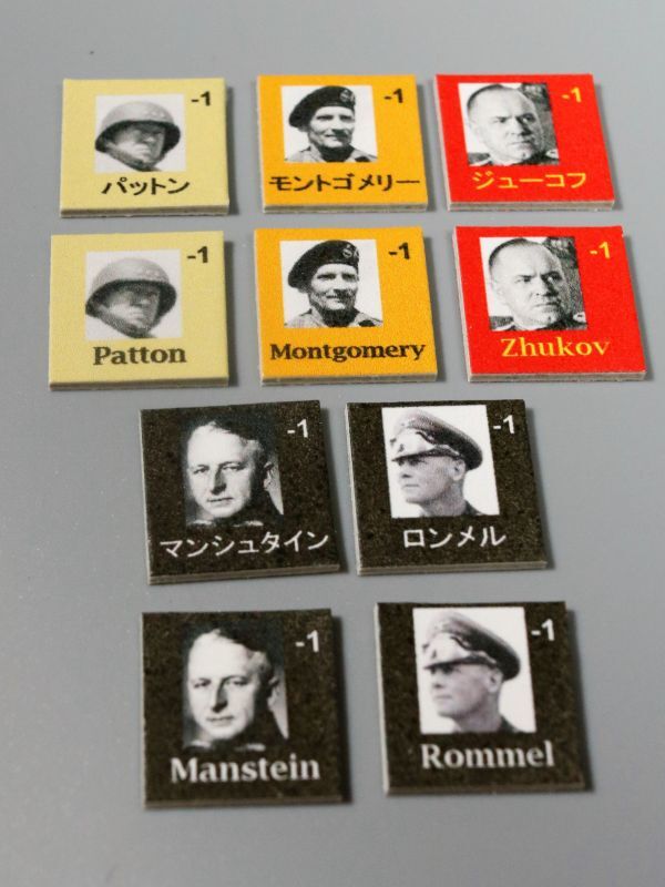 これはお遊び的なものですが、このゲームの選択ルールにはマンシュタインやパットンなど何人かの指揮官を追加することができるようになっています。しかしながら本体付属の指揮官ユニットは名前が書かれているだけで寂しいので、画像入りのユニットを作成しましたのでお付けします。追加される指揮官は5名なのですが、1名につき2種類(英語表記と日本語表記のもの)用意してあります。