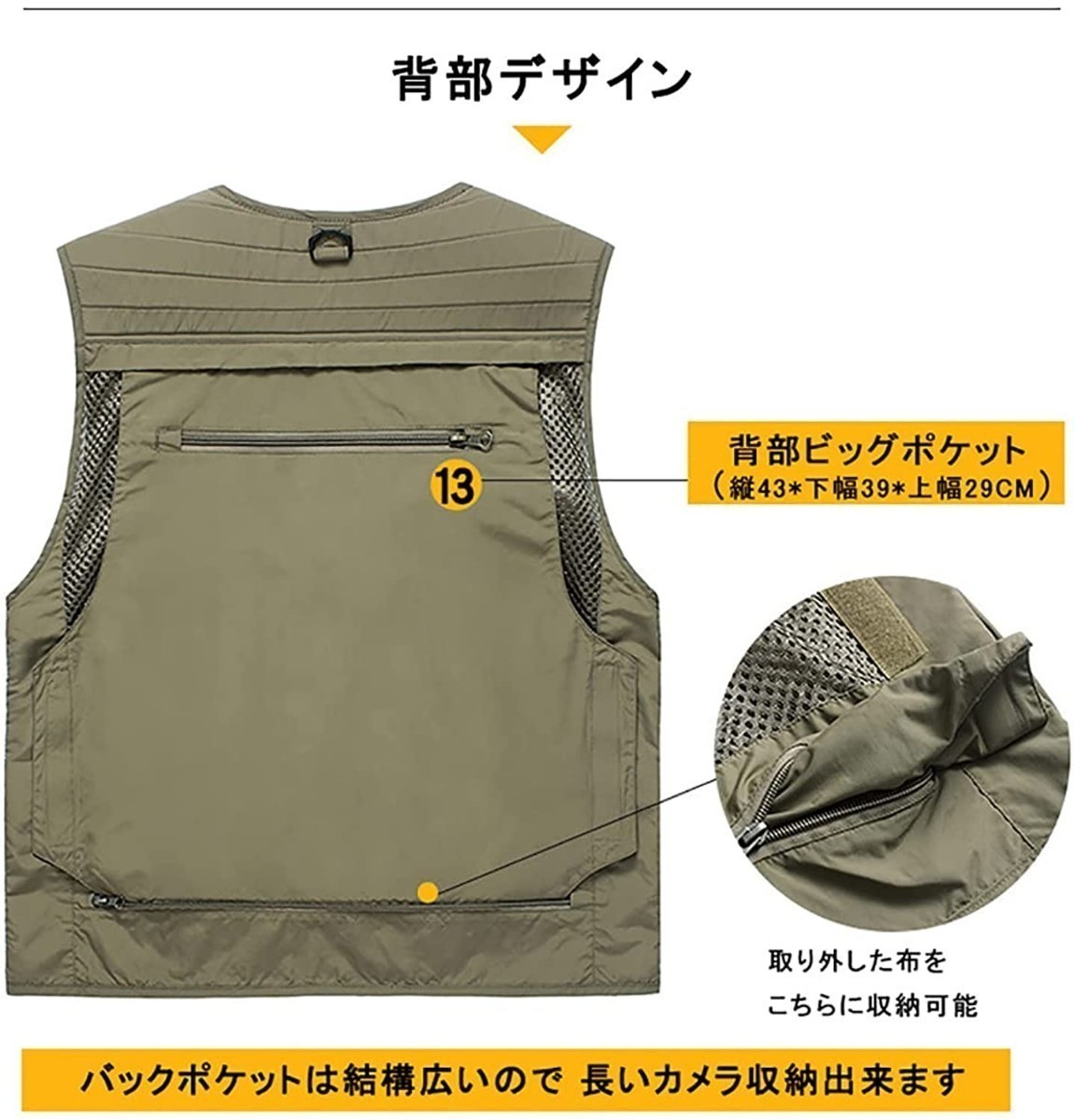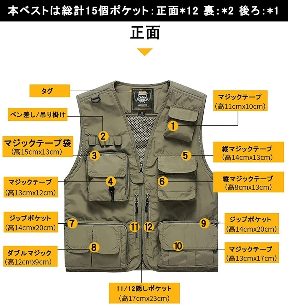通気性が良く、速乾性・防風性・防汚性にも優れています。抜群の収納力と軽量性、耐久性も揃えるベストです。季節や用途を問わず万能に使えるアウトドアベストです。ウオーキング、登山、撮影、釣り、フィッシング、作業、キャンプ、遠足、旅行、ランニング、サイクリング、ゴルフなどの幅広いなどのシーンで利用することができます。機能性にもしっかりこだわった一枚に仕上げています。防災バック替わりとしても役に立ちます。お誕生日などのギフトとしても最適です。