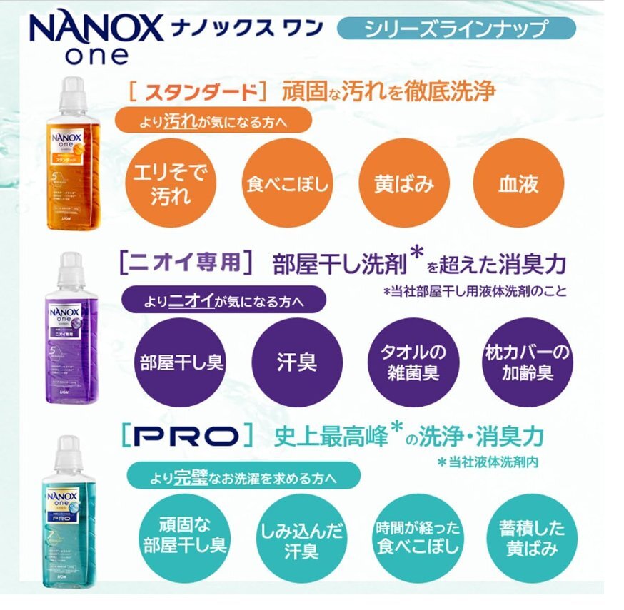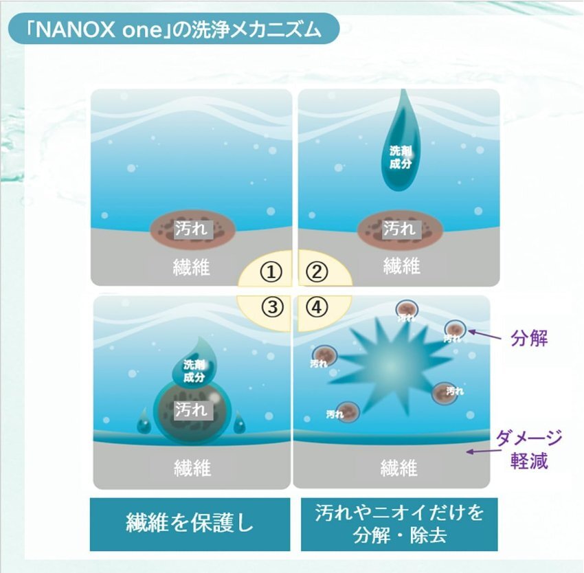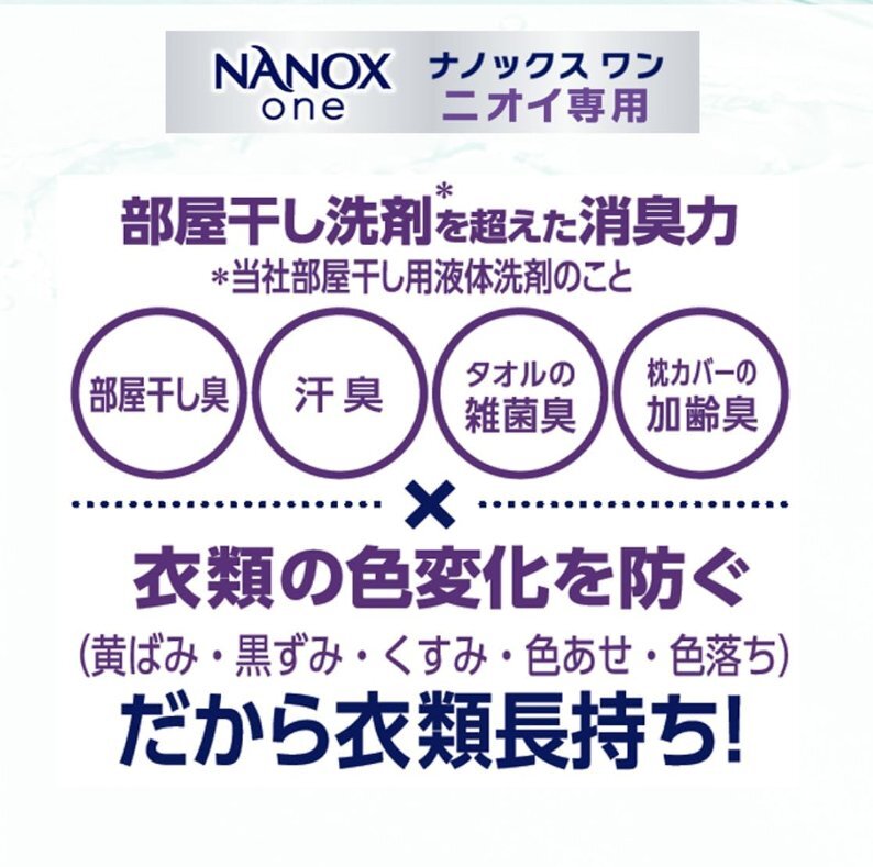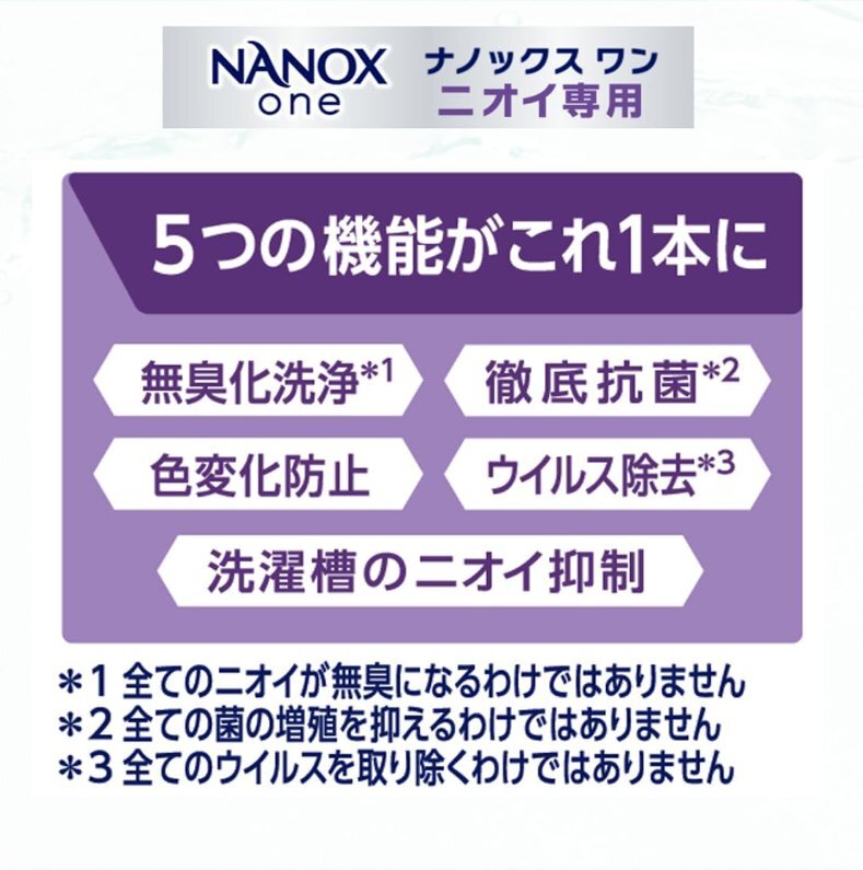 | 商品の説明 | ニオイ、汚れ、衣類の色変化を 1 本で全部断つ、高濃度コンプリートジェル。 【高い洗浄・消臭力】と【衣類本体の色を保つこと】を両立した唯一の洗剤。 衣類がいつまでも清潔で長く使えます。 より「消臭力」重視する方におすすめなのが、NANOX one ニオイ専用! ●衣類の色変化※1を防ぐ ※1:黄ばみ、黒ずみ、くすみ、色あせ、色落ち ●ウイルス除去※2 ※2:全てのウイルスを取り除くわけではありません ●徹底抗菌※3 ※3:全ての菌の増殖を抑えるわけではありません ●洗濯層のニオイ抑制 ●すすぎ1回 OK ●蛍光剤無配合 |