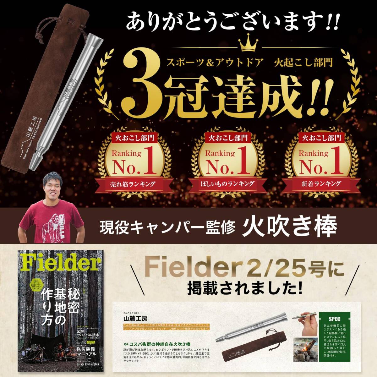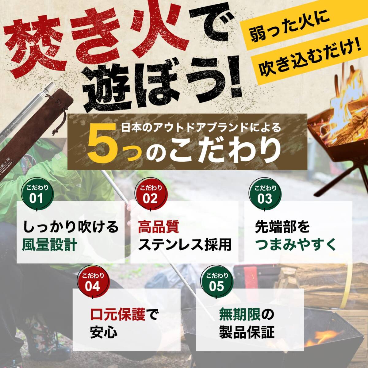【累計販売数1万個突破!】販売開始から累計販売数が1万件を突破しました。ありがとうございます!【現役キャンパー監修!】キャンプやバーベキューの際に役に立つ火吹き棒です。焚火の火が弱まってしまったとき、ピンポイントに酸素を送り込むことによってうちわなどとは違って灰が飛び散らず、火を何度も燃焼させることができます。現役キャンパーの監修のもと何度も調整を繰り返し、「送風のしやすさ」「持ち運びやすさ」「デザイン性」にこだわりました。