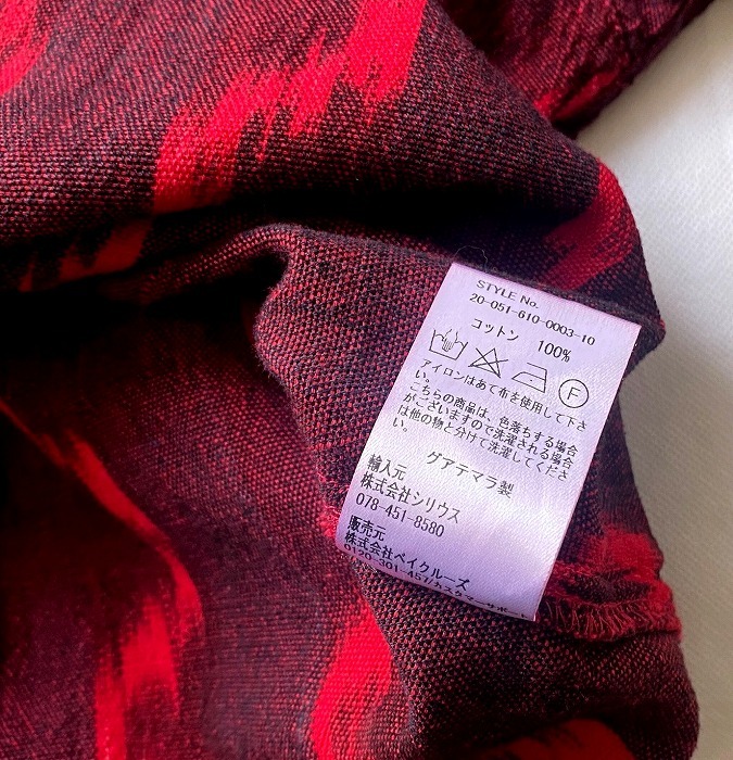 ・素材: コットン100% ・カラー: レッド ・サイズ: L 実寸(平置きにして)肩幅 約52.5cm・身幅 約61cm・着丈 約79.5cm・袖丈 約25cm(多少の誤差はお許しください) 現地の職人による手染めで、カスレ感とぼかしが効いたジグザグ柄が特徴。 左右で異なる柄の配置もハンドクラフトならではの風合いが魅力的。 素材はジュートのようなドライなシャリ感があり、夏場の羽織りやリラックススタイルにもぴったり。 ボタンも現地素材を使用し、細部までこだわりを感じます。 カジュアルなショーツからスラックスまで幅広くコーティネイト可能です。 ハンドメイドならではの温かみと、別注ならではの都会的センスが融合した1枚。 夏の主役シャツとしてもおすすめです。 目立つ傷み汚れなし。 MADE IN GUATEMARA かなりお値打ちだと思います。この機会にぜひ! 他にもいろいろ出品しています。 管理番号: 142508Y-090469 N2上 ★ |