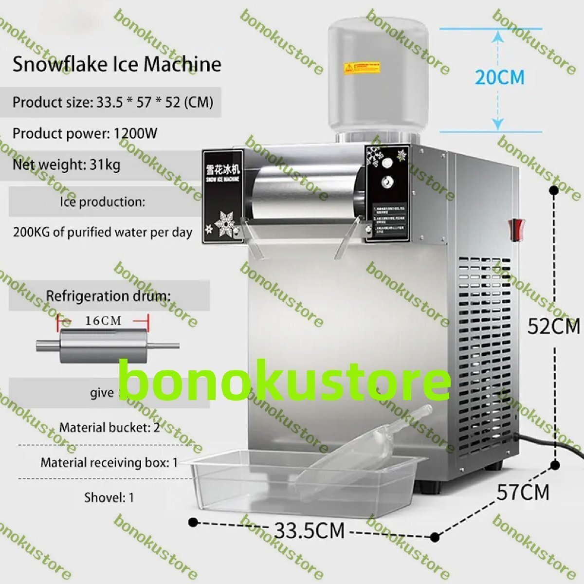 商品の説明 名前: スノーフレーク製氷機 電圧: 220V/110V 周波数: 50/60Hz 電力: 1200W 材質:ステンレス ローラー長さ:16cm 製氷能力:200kg/24時間 寸法: 335x570x520mm 重量: 31kg パック: 業務用ローラー製氷機 1台 素材ボックス1個 バレル2個 シャベル1個 名前: スノ