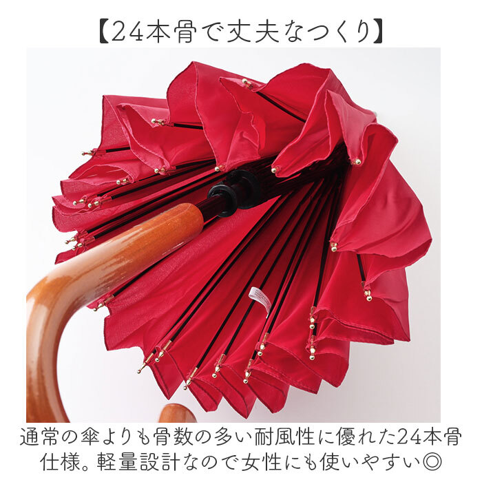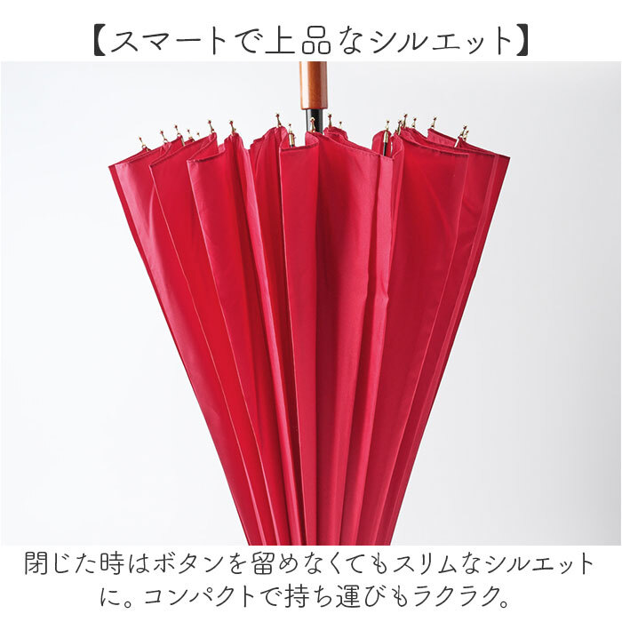 商品説明 | ・・【和傘のような美しいフォルム】 ・和服でも洋服にもマッチする「Natural basic 58cm 24本骨 傘」が登場。 ・【スマートで上品なシルエット】 ・閉じた時はボタンを留めなくてもスリムなシルエットに。コンパクトで持ち運びもラクラク。 ・【24本骨で丈夫なつくり】 ・通常の傘よりも骨数の多い耐風性に優れた24本骨仕様。軽量設計なので女性にも使いやすい◎ ・【丈夫なグラスファイバー製】 ・しなやかで折れにくくサビにくい!親骨や受骨には軽量のオールグラスファイバー骨を採用。 ・【風に負けない耐風設計】 ・反り返っても簡単に元に戻る耐風骨仕様!強い風の日だって壊れにくくて安心。 ・【スムーズな手開きタイプ】 ・混雑した場所でも傘生地をスムーズかつ、安全に開くことのできる手開き式。 ・【指先を守る安全カバー】 ・ハジキ部分には爪や指を挟む心配のない安全カバー付きなので、ネイルした指先もしっかりガード ・【握りやすいハンドル】 ・手元ハンドルは指先に馴染んでしっかりと握りやすい、上品な雰囲気の木目調。 ・【まとめやすいボタン式バンド】 ・傘生地を留めるバンドは、パチンっと留めやすいスナップボタン式。 ・【シンプルなデザイン】 ・性別や年代問わず持ちやすいワンカラー。つゆ先やバンドのカシメにはゴールドの金具を使用。 |