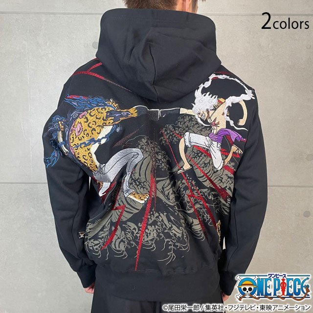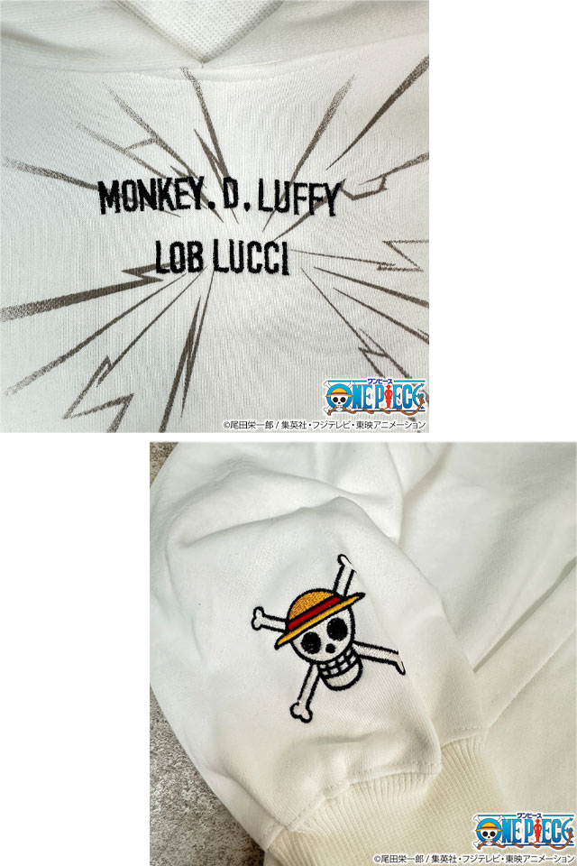 超人気のONE PIECEコラボからエッグヘッド編の新アイテムが登場!! 今回も全て限定描き下ろし!!! ルフィとルッチが拳を交えたシーンを刺繍! 2人の激しい決闘をプルパーカーでデザイン。 麦わらの一味の海賊旗マーク、世界政府のシンボルも刺繍した | |||||||||||||||||||||||||