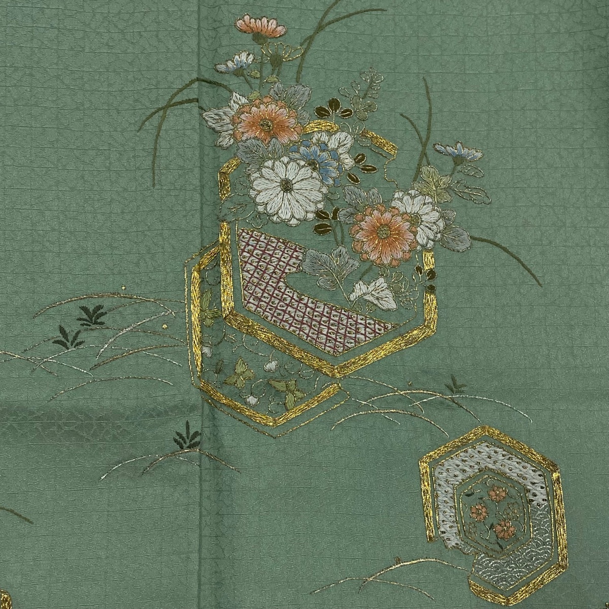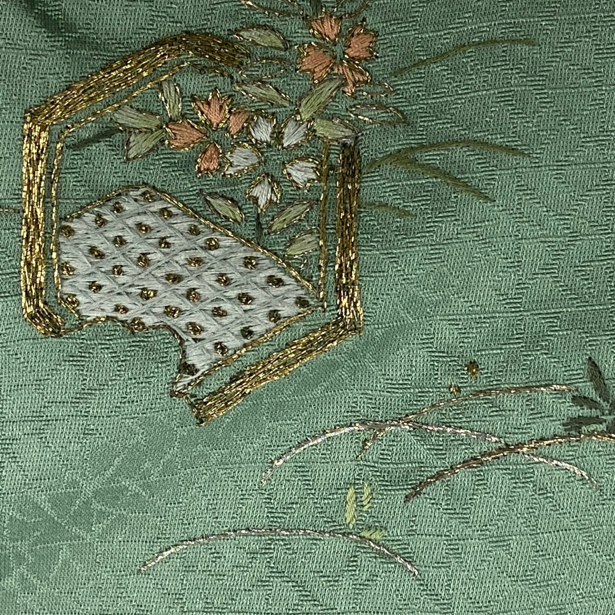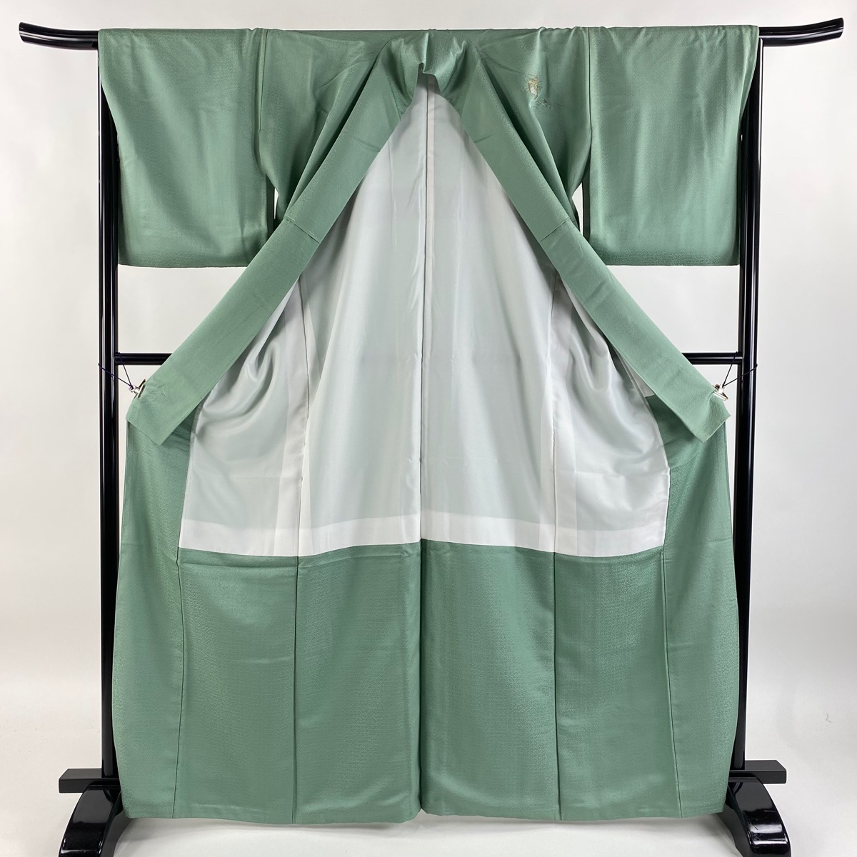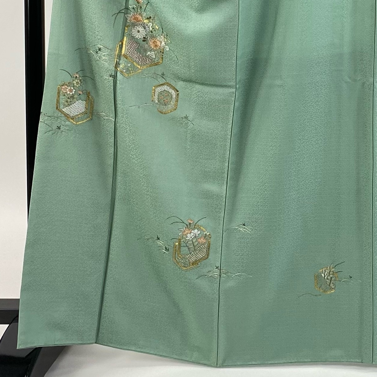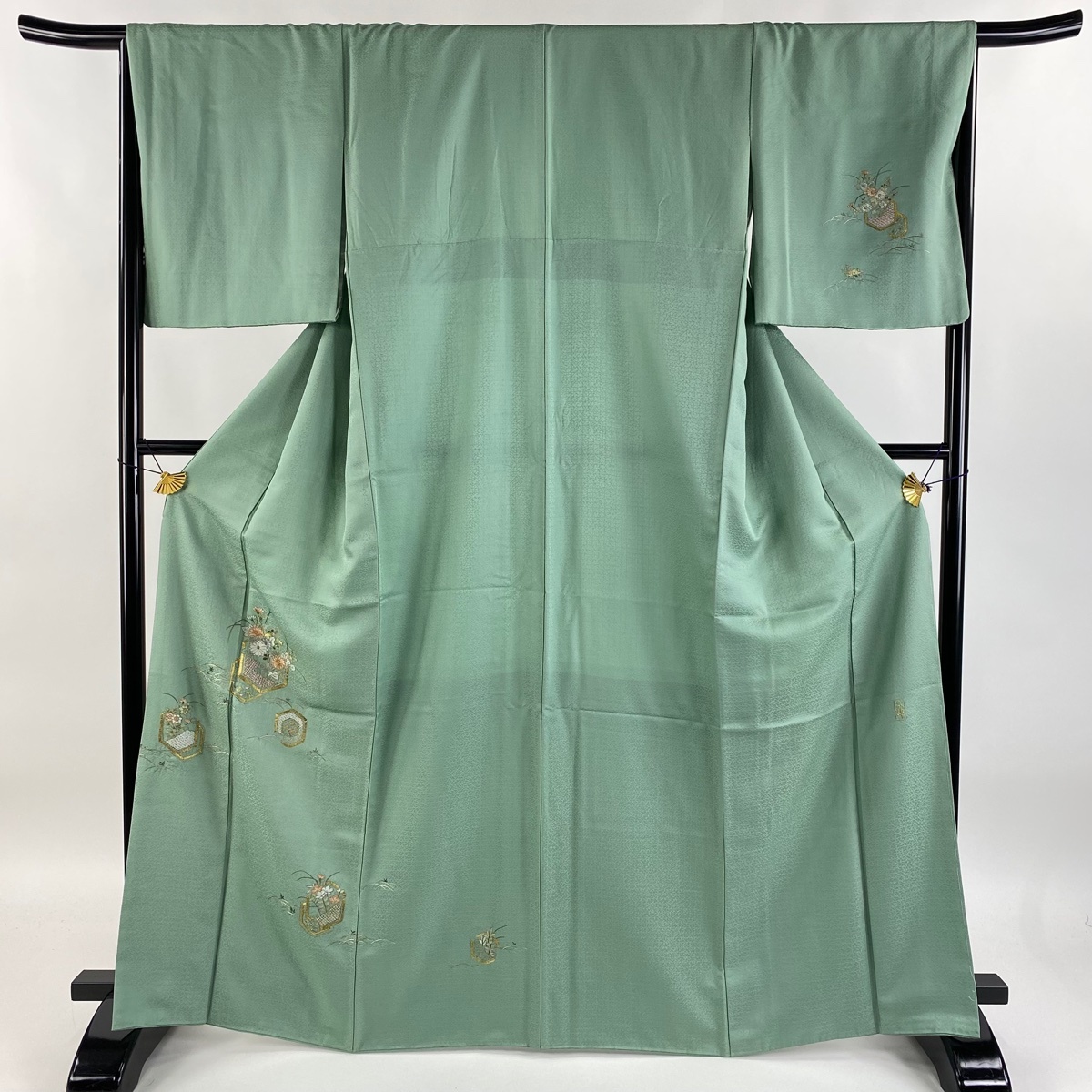 付下げ 秀品 草花 露芝 金銀糸 刺繍 薄緑 袷 身丈166 裄丈66.5 M 正絹 【中古】 |
