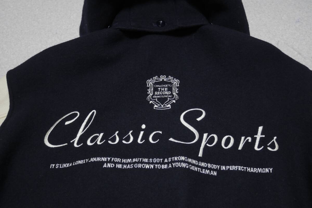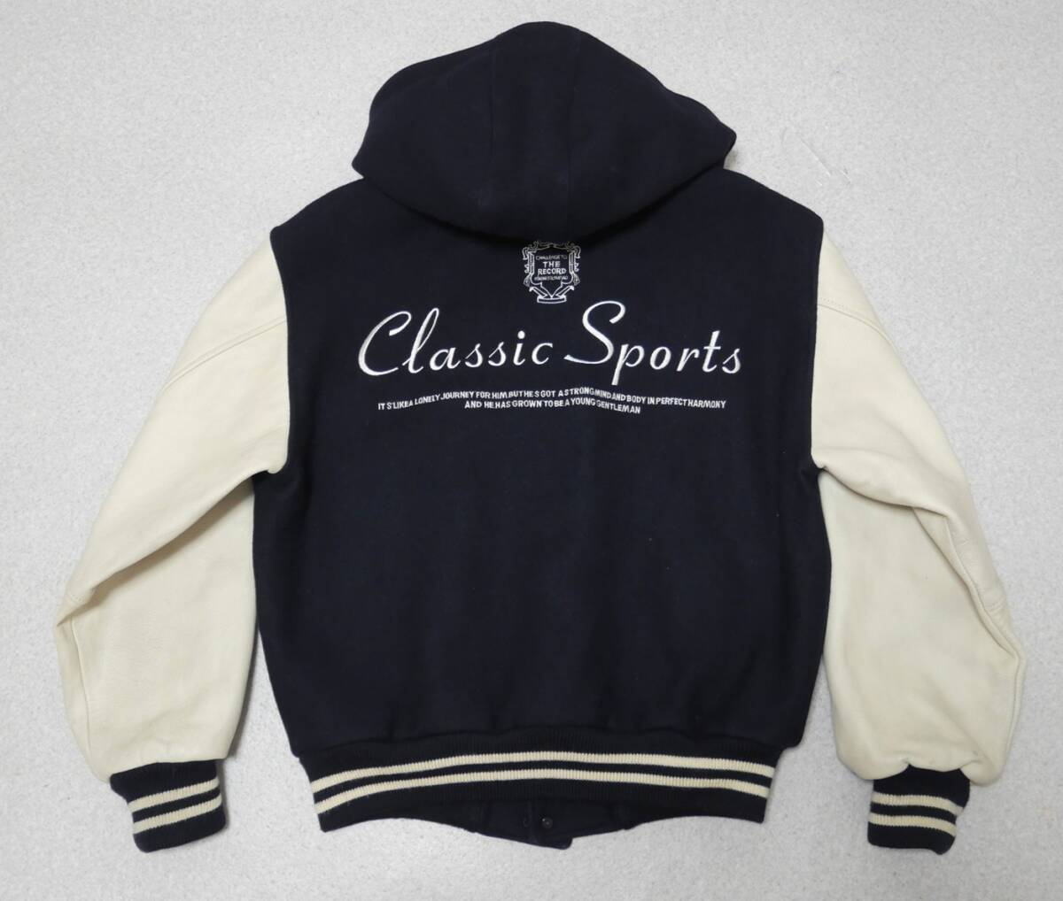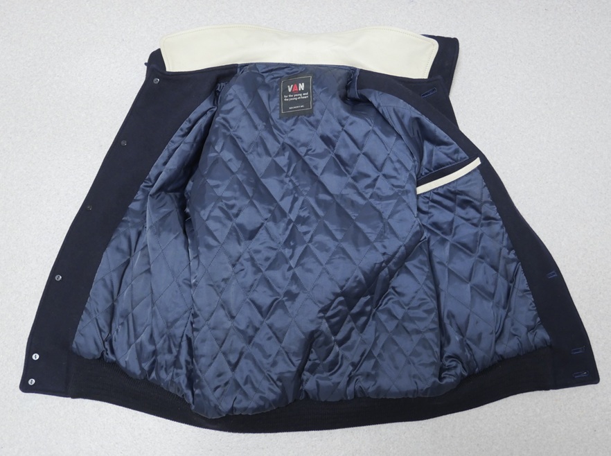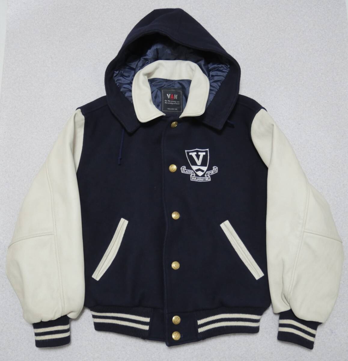 VAN JAC 金ボタン フード 袖革スタジャン 紺 M ヴァンヂャケット 袖レザー ジャケット