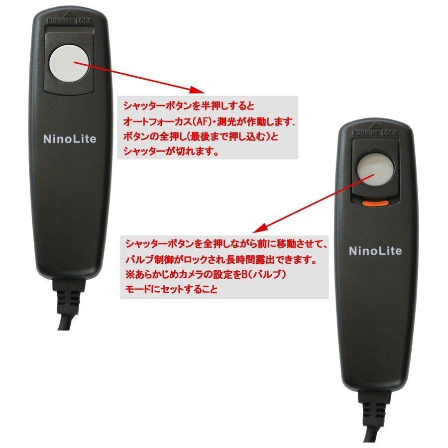 機能 | 2段式のリモコンボタン(シャッター)です。 ・シャッター半押し(AFロック)⇒オートフォーカス・測光ができます。 ・シャッター全押し⇒シャッターが下り、撮影ができます。 ・シャッター全押ししながら前に移動させる(ホールド) ⇒バルブ制御がロックされ長時間露出できます。(本体にバルブ制御機能付の場合) |