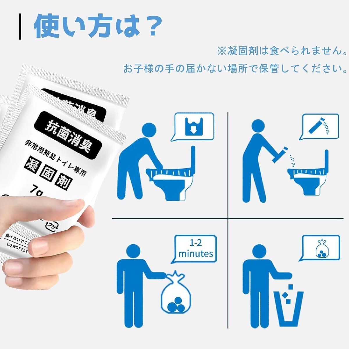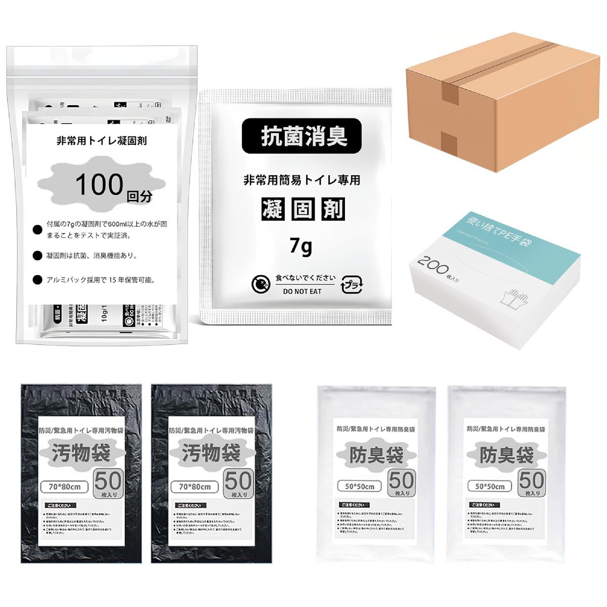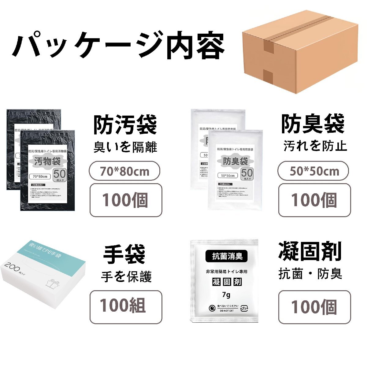 ブランド:LYHBSXカラー:7g-100回分(豪華セット)サイズ:100回分(豪華セット)【多用途凝固剤セット緊急時も安心のトイレ環境を提供】【製品特徴】1.緊急時や災害時の理想的なソリューション:この非常用凝固剤セットは、緊急事態や災害が発生した際に便利なトイレソリューションを提供します。2.抗菌・消臭機能:凝固剤には、先進的な抗菌および消臭成分が含まれており、使用後24時間以内に99%の細菌や臭いを減少させます。特に災害時に清潔なトイレ環境を確保できます。3.長期保存可能:高品質なアルミ製パッケージを使用しており、最大15年間の保存が可能です。家庭やオフィスの防災備蓄に最適です。4.軽量で持ち運びが簡単:セットには100包の高効率凝固剤、100個の防臭袋、100個の防汚袋、100双の使い捨て手袋が含まれており、軽量でコンパクトです。バッグや車に簡単に収納でき、取り付けはわずか20秒で完了します。【製品用途】この凝固剤セットはさまざまなシーンで活躍します:1.災害時:地震や断水、停電などの緊急時に、家庭や避難所で衛生的なトイレ環境を提供します。非常用備蓄品として迅速かつ安全に対応できます。2.アウトドア活動:キャンプ、登山、長距離ドライブなどのアウトドア活動で、携帯トイレとして利用できます。外出先でも清潔さを維持し、便利なトイレ環境を提供します。3.旅行時:長時間の移動中や旅行先で、携帯性が高く、車内や宿泊先の非常用トイレとしても最適です。【製品の包装内容】このセットには以下のアイテムが含まれています:1.高吸水性凝固剤:100包、高い吸水性と抗菌・消臭機能を備え、衛生的なトイレ環境を提供します。2.防臭袋:100個、使用後の廃棄物をしっかりと封じ込め、臭い漏れを防ぎます。3.防汚袋:100個、清潔で衛生的な処理をサポートします。4.使い捨て手袋:100双、衛生的な使用をサポートし、手を汚さずに処理が可能です。【注意事項】1.使用期限:凝固剤は最大15年間保存可能ですが、開封後は速やかに使用してください。保存状態や保管環境により劣化する場合があります。2.保存方法:高温多湿や直射日光を避け、乾燥した場所に保管してください。3.使用方法:使用前に必ず取扱説明書をお読みください。適切な使用方法を守ることで、効果的に利用できます。4.衛生管理:使用後は手をよく洗い、手袋や防臭袋を適切に処理してください。安全と衛生を守るために、使用後の取り扱いには十分ご注意ください。5.優れた防災製品:この凝固剤セットは、災害時やアウトドア活動において安心して使用できる優れた防災グッズです。家庭や企業での備えとしてもおすすめです。ご不明点や問題がございましたら、お気軽にお問い合わせください。迅速に対応いたします。【防災の必需品としての安心感】災害時や緊急事態、特に日本で頻発する地震や台風、大雨による断水や停電の際、トイレの利用が困難になることがあります。LYHBSXの凝固剤セットは、トイレ問題を迅速に解決し、災害時でも衛生的で快適な環境を提供します。特に防災グッズとして、家族全員が使える安全で信頼性の高い製品です。