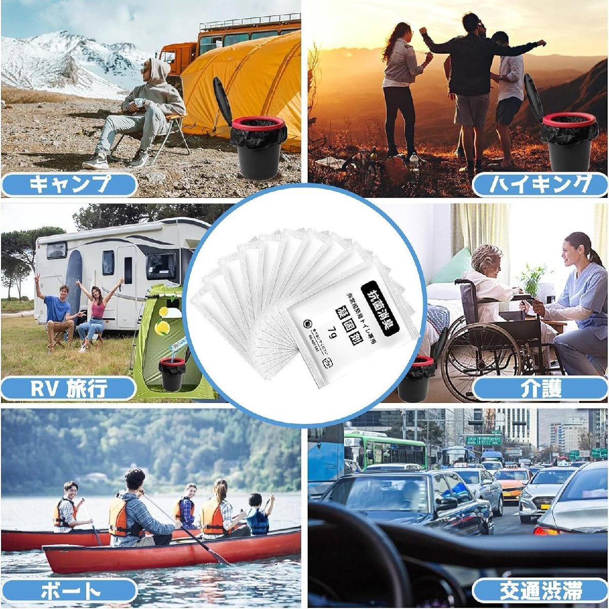 【多用途で幅広いシーンに対応】この凝固剤セットは、災害時だけでなく、アウトドア、キャンプ、登山、介護用途としても利用可能です。高齢者や行動が不自由な方の日常的なケアにも役立ち、幅広いニーズに対応しています。また、長距離ドライブや旅行時の急なトイレ問題にも素早く対応できるため、日本の多様なライフスタイルに合った万能アイテムです。