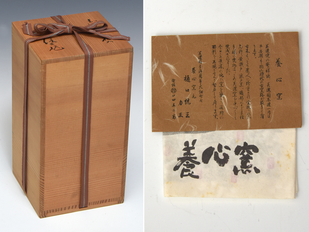 養心窯 樋口統三(作)志野花入です。 高台脇に印あり。 ほとんど使用歴なく汚損破損のない美品です。 ※撮影の際に生じた写り込みなどがございます。 ご理解の程よろしくお願い致します。 |